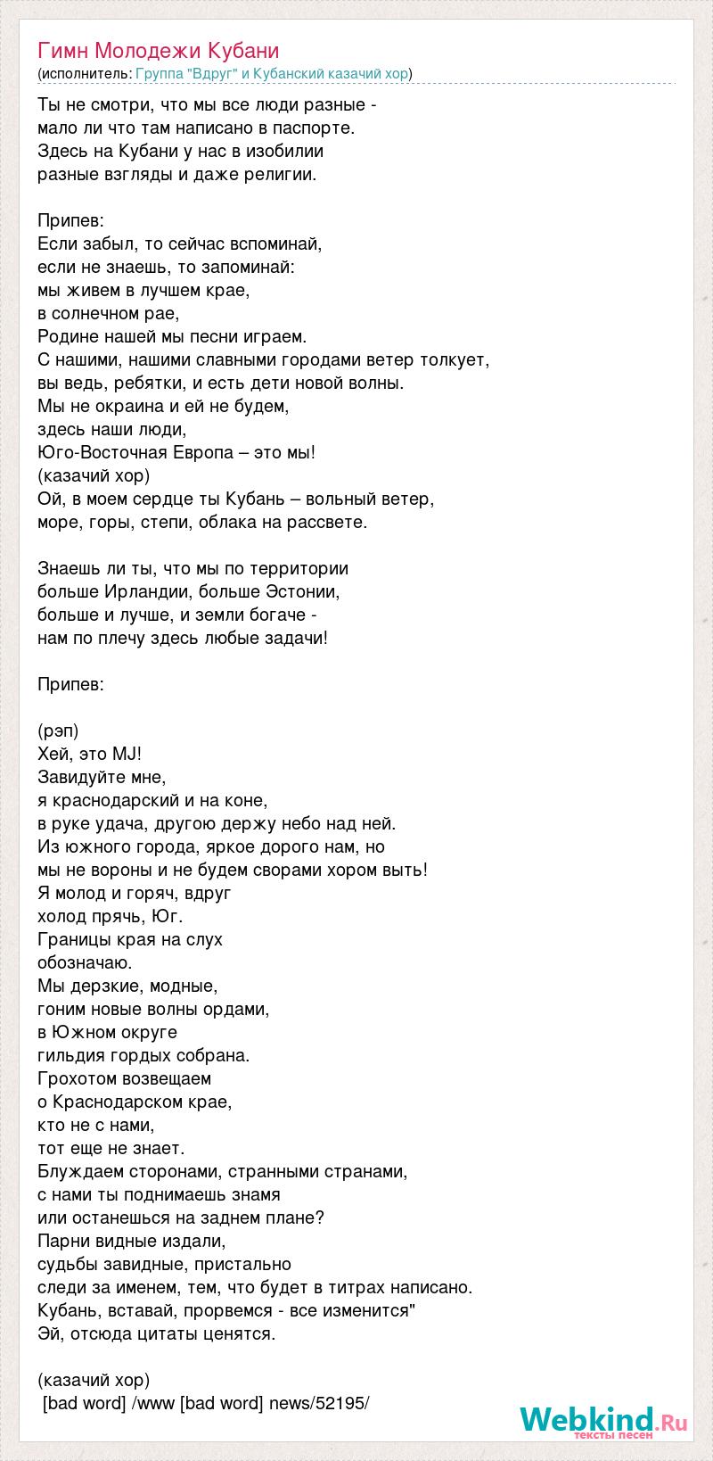Ты не смотри, что мы все люди разные - мало ли что там написано в паспорте. Здесь на Кубани у нас в изобилии разные взгляды и даже религии. Припев: Если забыл, то сейчас вспоминай, если не знаешь, то запоминай: мы живем в лучшем крае, в солнечном рае, Родине нашей мы песни играем. С нашими, нашими славными городами ветер толкует, вы ведь, ребятки, и есть дети новой волны. Мы не окраина и ей не будем, здесь наши люди, Юго-Восточная Европа – это мы! (казачий хор) Ой, в моем сердце ты Кубань – вольный ветер, море, горы, степи, облака на рассвете. Знаешь ли ты, что мы по территории больше Ирландии, больше Эстонии, больше и лучше, и земли богаче - нам по плечу здесь любые задачи! Припев: (рэп) Хей, это MJ! Завидуйте мне, я краснодарский и на коне, в руке удача, другою держу небо над ней. Из южного города, яркое дорого нам, но мы не вороны и не будем сворами хором выть! Я молод и горяч, вдруг холод прячь, Юг. Границы края на слух обозначаю. Мы дерзкие, модные, гоним новые волны ордами, в Южном округе гильдия гордых собрана. Грохотом возвещаем о Краснодарском крае, кто не с нами, тот еще не знает. Блуждаем сторонами, странными странами, с нами ты поднимаешь знамя или останешься на заднем плане? Парни видные издали, судьбы завидные, пристально следи за именем, тем, что будет в титрах написано. Кубань, вставай, прорвемся - все изменится" Эй, отсюда цитаты ценятся. (казачий хор) [bad word] /www [bad word] news/52195/