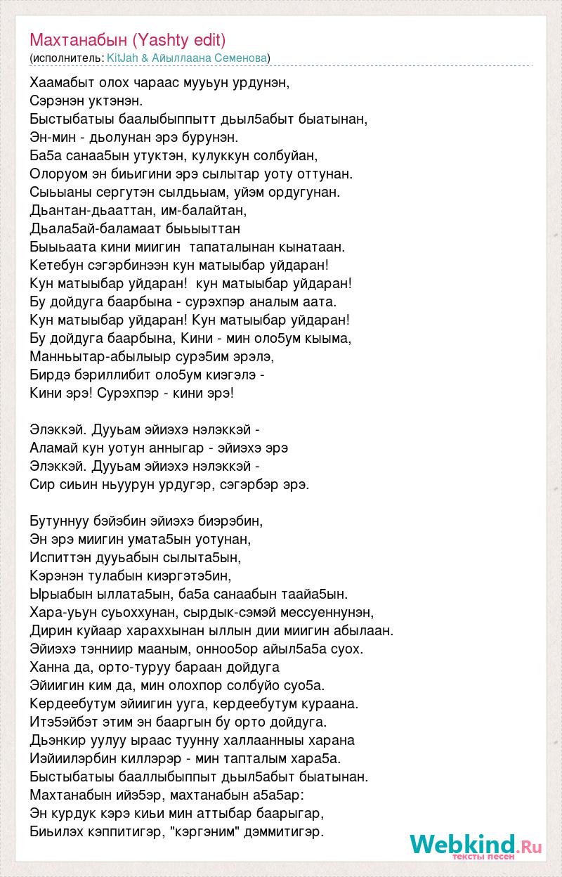 Хаамабыт олох чараас мууьун урдунэн, Сэрэнэн уктэнэн. Быстыбатыы баалыбыппытт дьыл5абыт быатынан, Эн-мин - дьолунан эрэ бурунэн. Ба5а санаа5ын утуктэн, кулуккун солбуйан, Олоруом эн биьигини эрэ сылытар уоту оттунан. Сыьыаны сергутэн сылдьыам, уйэм ордугунан. Дьантан-дьааттан, им-балайтан, Дьала5ай-баламаат быьыыттан Быыьаата кини миигин тапаталынан кынатаан. Кетебун сэгэрбинээн кун матыыбар уйдаран! Кун матыыбар уйдаран! кун матыыбар уйдаран! Бу дойдуга баарбына - сурэхпэр аналым аата. Кун матыыбар уйдаран! Кун матыыбар уйдаран! Бу дойдуга баарбына, Кини - мин оло5ум кыыма, Манньытар-абылыыр сурэ5им эрэлэ, Бирдэ бэриллибит оло5ум киэгэлэ - Кини эрэ! Сурэхпэр - кини эрэ! Элэккэй. Дууьам эйиэхэ нэлэккэй - Аламай кун уотун анныгар - эйиэхэ эрэ Элэккэй. Дууьам эйиэхэ нэлэккэй - Сир сиьин ньуурун урдугэр, сэгэрбэр эрэ. Бутуннуу бэйэбин эйиэхэ биэрэбин, Эн эрэ миигин умата5ын уотунан, Испиттэн дууьабын сылыта5ын, Кэрэнэн тулабын киэргэтэ5ин, Ырыабын ыллата5ын, ба5а санаабын таайа5ын. Хара-уьун суьоххунан, сырдык-сэмэй мессуеннунэн, Дирин куйаар хараххынан ыллын дии миигин абылаан. Эйиэхэ тэнниир мааным, онноо5ор айыл5а5а суох. Ханна да, орто-туруу бараан дойдуга Эйиигин ким да, мин олохпор солбуйо суо5а. Кердеебутум эйиигин ууга, кердеебутум кураана. Итэ5эйбэт этим эн бааргын бу орто дойдуга. Дьэнкир уулуу ыраас туунну халлаанныы харана Иэйиилэрбин киллэрэр - мин тапталым хара5а. Быстыбатыы бааллыбыппыт дьыл5абыт быатынан. Махтанабын ийэ5эр, махтанабын а5а5ар: Эн курдук кэрэ киьи мин аттыбар баарыгар, Биьилэх кэппитигэр, "кэргэним" дэммитигэр.