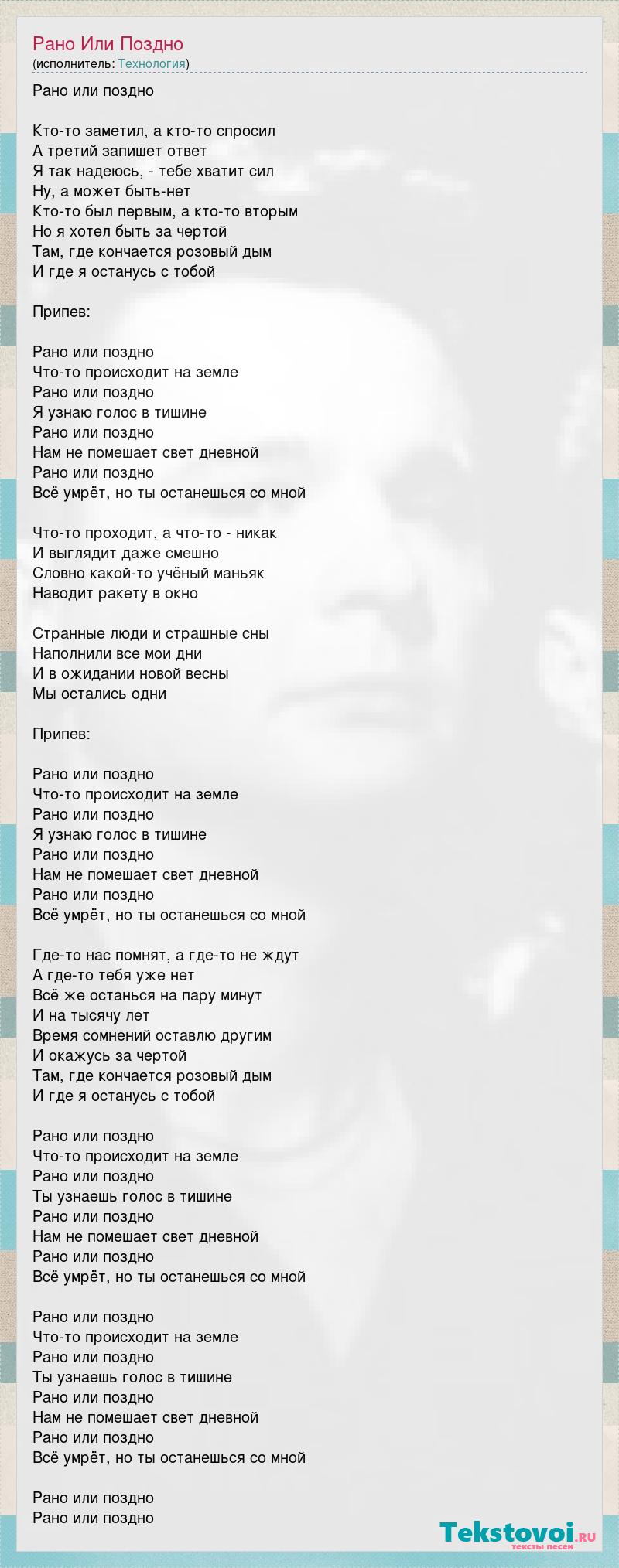 Рано или поздно Кто-то заметил, а кто-то спросил А третий запишет ответ Я так надеюсь, - тебе хватит сил Ну, а может быть-нет Кто-то был первым, а кто-то вторым Но я хотел быть за чертой Там, где кончается розовый дым И где я останусь с тобой Припев: Рано или поздно Что-то происходит на земле Рано или поздно Я узнаю голос в тишине Рано или поздно Нам не помешает свет дневной Рано или поздно Всё умрёт, но ты останешься со мной Что-то проходит, а что-то - никак И выглядит даже смешно Словно какой-то учёный маньяк Наводит ракету в окно Странные люди и страшные сны Наполнили все мои дни И в ожидании новой весны Мы остались одни Припев: Рано или поздно Что-то происходит на земле Рано или поздно Я узнаю голос в тишине Рано или поздно Нам не помешает свет дневной Рано или поздно Всё умрёт, но ты останешься со мной Где-то нас помнят, а где-то не ждут А где-то тебя уже нет Всё же останься на пару минут И на тысячу лет Время сомнений оставлю другим И окажусь за чертой Там, где кончается розовый дым И где я останусь с тобой Рано или поздно Что-то происходит на земле Рано или поздно Ты узнаешь голос в тишине Рано или поздно Нам не помешает свет дневной Рано или поздно Всё умрёт, но ты останешься со мной Рано или поздно Что-то происходит на земле Рано или поздно Ты узнаешь голос в тишине Рано или поздно Нам не помешает свет дневной Рано или поздно Всё умрёт, но ты останешься со мной Рано или поздно Рано или поздно