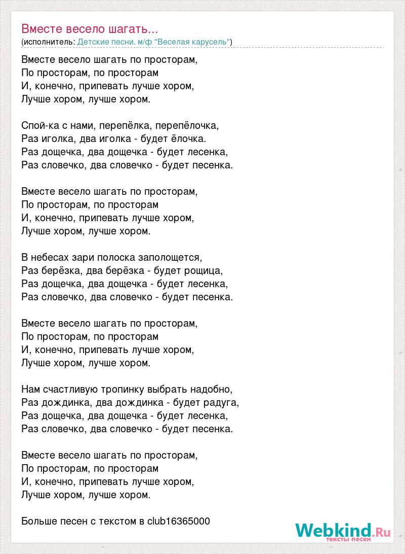 Вместе весело шагать по просторам, По просторам, по просторам И, конечно, припевать лучше хором, Лучше хором, лучше хором. Спой-ка с нами, перепёлка, перепёлочка, Раз иголка, два иголка - будет ёлочка. Раз дощечка, два дощечка - будет лесенка, Раз словечко, два словечко - будет песенка. Вместе весело шагать по просторам, По просторам, по просторам И, конечно, припевать лучше хором, Лучше хором, лучше хором. В небесах зари полоска заполощется, Раз берёзка, два берёзка - будет рощица, Раз дощечка, два дощечка - будет лесенка, Раз словечко, два словечко - будет песенка. Вместе весело шагать по просторам, По просторам, по просторам И, конечно, припевать лучше хором, Лучше хором, лучше хором. Нам счастливую тропинку выбрать надобно, Раз дождинка, два дождинка - будет радуга, Раз дощечка, два дощечка - будет лесенка, Раз словечко, два словечко - будет песенка. Вместе весело шагать по просторам, По просторам, по просторам И, конечно, припевать лучше хором, Лучше хором, лучше хором. Больше песен с текстом в club16365000