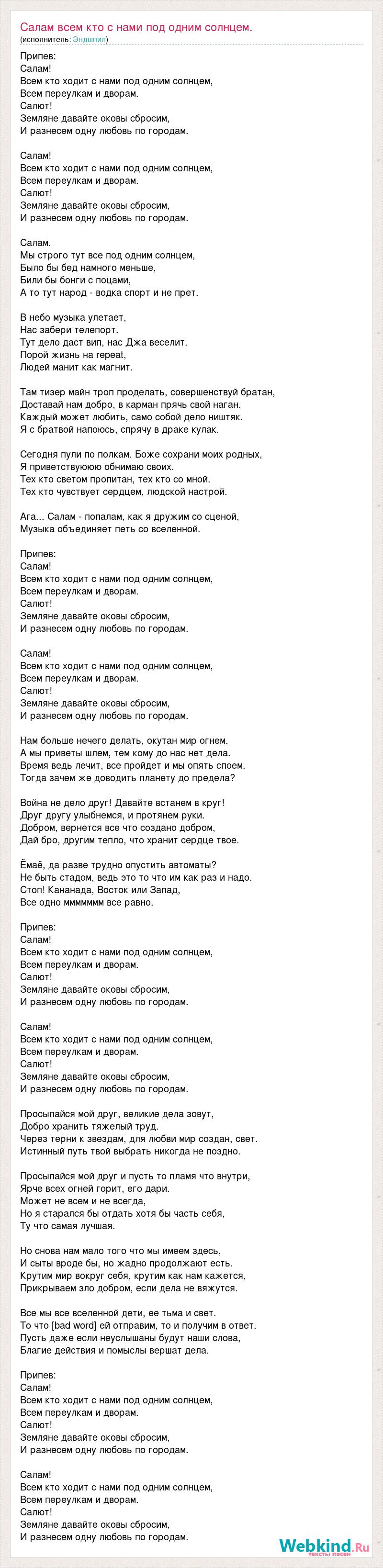 Припев: Салам! Всем кто ходит с нами под одним солнцем, Всем переулкам и дворам. Салют! Земляне давайте оковы сбросим, И разнесем одну любовь по городам. Салам! Всем кто ходит с нами под одним солнцем, Всем переулкам и дворам. Салют! Земляне давайте оковы сбросим, И разнесем одну любовь по городам. Салам. Мы строго тут все под одним солнцем, Было бы бед намного меньше, Били бы бонги с поцами, А то тут народ - водка спорт и не прет. В небо музыка улетает, Нас забери телепорт. Тут дело даст вип, нас Джа веселит. Порой жизнь на repeat, Людей манит как магнит. Там тизер майн троп проделать, совершенствуй братан, Доставай нам добро, в карман прячь свой наган. Каждый может любить, само собой дело ништяк. Я с братвой напоюсь, спрячу в драке кулак. Сегодня пули по полкам. Боже сохрани моих родных, Я приветствуююю обнимаю своих. Тех кто светом пропитан, тех кто со мной. Тех кто чувствует сердцем, людской настрой. Ага... Салам - попалам, как я дружим со сценой, Музыка объединяет петь со вселенной. Припев: Салам! Всем кто ходит с нами под одним солнцем, Всем переулкам и дворам. Салют! Земляне давайте оковы сбросим, И разнесем одну любовь по городам. Салам! Всем кто ходит с нами под одним солнцем, Всем переулкам и дворам. Салют! Земляне давайте оковы сбросим, И разнесем одну любовь по городам. Нам больше нечего делать, окутан мир огнем. А мы приветы шлем, тем кому до нас нет дела. Время ведь лечит, все пройдет и мы опять споем. Тогда зачем же доводить планету до предела? Война не дело друг! Давайте встанем в круг! Друг другу улыбнемся, и протянем руки. Добром, вернется все что создано добром, Дай бро, другим тепло, что хранит сердце твое. Ёмаё, да разве трудно опустить автоматы? Не быть стадом, ведь это то что им как раз и надо. Стоп! Кананада, Восток или Запад, Все одно ммммммм все равно. Припев: Салам! Всем кто ходит с нами под одним солнцем, Всем переулкам и дворам. Салют! Земляне давайте оковы сбросим, И разнесем одну любовь по городам. Салам! Всем кто ходит с нами под одним солнцем, Всем переулкам и дворам. Салют! Земляне давайте оковы сбросим, И разнесем одну любовь по городам. Просыпайся мой друг, великие дела зовут, Добро хранить тяжелый труд. Через терни к звездам, для любви мир создан, свет. Истинный путь твой выбрать никогда не поздно. Просыпайся мой друг и пусть то пламя что внутри, Ярче всех огней горит, его дари. Может не всем и не всегда, Но я старался бы отдать хотя бы часть себя, Ту что самая лучшая. Но снова нам мало того что мы имеем здесь, И сыты вроде бы, но жадно продолжают есть. Крутим мир вокруг себя, крутим как нам кажется, Прикрываем зло добром, если дела не вяжутся. Все мы все вселенной дети, ее тьма и свет. То что [bad word] ей отправим, то и получим в ответ. Пусть даже если неуслышаны будут наши слова, Благие действия и помыслы вершат дела. Припев: Салам! Всем кто ходит с нами под одним солнцем, Всем переулкам и дворам. Салют! Земляне давайте оковы сбросим, И разнесем одну любовь по городам. Салам! Всем кто ходит с нами под одним солнцем, Всем переулкам и дворам. Салют! Земляне давайте оковы сбросим, И разнесем одну любовь по городам.