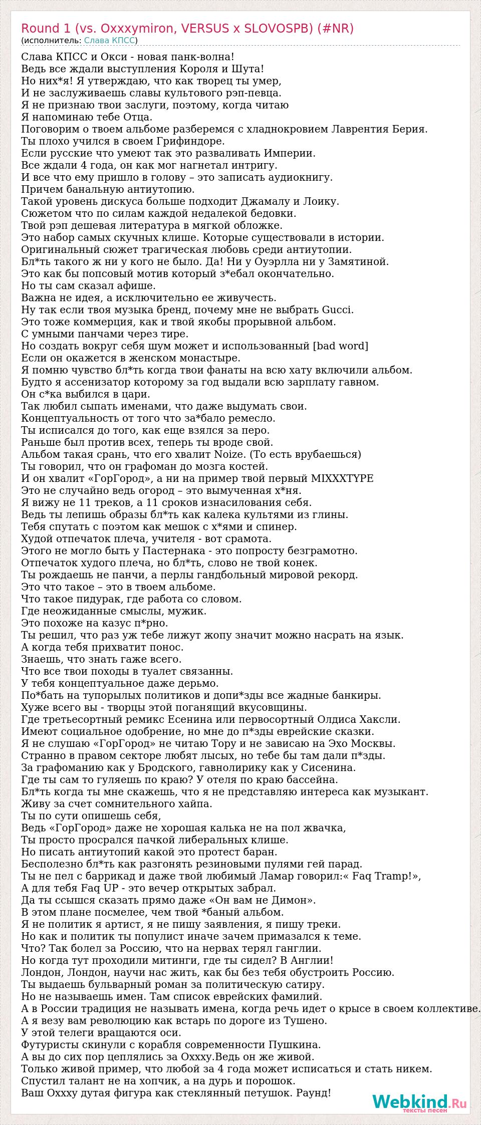 Слава КПСС и Окси - новая панк-волна! Ведь все ждали выступления Короля и Шута! Но них*я! Я утверждаю, что как творец ты умер, И не заслуживаешь славы культового рэп-певца. Я не признаю твои заслуги, поэтому, когда читаю Я напоминаю тебе Отца. Поговорим о твоем альбоме разберемся с хладнокровием Лаврентия Берия. Ты плохо учился в своем Грифиндоре. Если русские что умеют так это разваливать Империи. Все ждали 4 года, он как мог нагнетал интригу. И все что ему пришло в голову – это записать аудиокнигу. Причем банальную антиутопию. Такой уровень дискуса больше подходит Джамалу и Лоику. Сюжетом что по силам каждой недалекой бедовки. Твой рэп дешевая литература в мягкой обложке. Это набор самых скучных клише. Которые существовали в истории. Оригинальный сюжет трагическая любовь среди антиутопии. Бл*ть такого ж ни у кого не было. Да! Ни у Оуэрлла ни у Замятиной. Это как бы попсовый мотив который з*ебал окончательно. Но ты сам сказал афише. Важна не идея, а исключительно ее живучесть. Ну так если твоя музыка бренд, почему мне не выбрать Gucci. Это тоже коммерция, как и твой якобы прорывной альбом. С умными панчами через тире. Но создать вокруг себя шум может и использованный [bad word] Если он окажется в женском монастыре. Я помню чувство бл*ть когда твои фанаты на всю хату включили альбом. Будто я ассенизатор которому за год выдали всю зарплату гавном. Он с*ка выбился в цари. Так любил сыпать именами, что даже выдумать свои. Концептуальность от того что за*бало ремесло. Ты исписался до того, как еще взялся за перо. Раньше был против всех, теперь ты вроде свой. Альбом такая срань, что его хвалит Noize. (То есть врубаешься) Ты говорил, что он графоман до мозга костей. И он хвалит «ГорГород», а ни на пример твой первый MIXXXTYPE Это не случайно ведь огород – это вымученная х*ня. Я вижу не 11 треков, а 11 сроков изнасилования себя. Ведь ты лепишь образы бл*ть как калека культями из глины. Тебя спутать с поэтом как мешок с х*ями и спинер. Худой отпечаток плеча, учителя - вот срамота. Этого не могло быть у Пастернака - это попросту безграмотно. Отпечаток худого плеча, но бл*ть, слово не твой конек. Ты рождаешь не панчи, а перлы гандбольный мировой рекорд. Это что такое – это в твоем альбоме. Что такое пидурак, где работа со словом. Где неожиданные смыслы, мужик. Это похоже на казус п*рно. Ты решил, что раз уж тебе лижут жопу значит можно насрать на язык. А когда тебя прихватит понос. Знаешь, что знать гаже всего. Что все твои походы в туалет связанны. У тебя концептуальное даже дерьмо. По*бать на тупорылых политиков и допи*зды все жадные банкиры. Хуже всего вы - творцы этой поганящий вкусовщины. Где третьесортный ремикс Есенина или первосортный Олдиса Хаксли. Имеют социальное одобрение, но мне до п*зды еврейские сказки. Я не слушаю «ГорГород» не читаю Тору и не зависаю на Эхо Москвы. Странно в правом секторе любят лысых, но тебе бы там дали п*зды. За графоманию как у Бродского, гавнолирику как у Сисенина. Где ты сам то гуляешь по краю? У отеля по краю бассейна. Бл*ть когда ты мне скажешь, что я не представляю интереса как музыкант. Живу за счет сомнительного хайпа. Ты по сути опишешь себя, Ведь «ГорГород» даже не хорошая калька не на пол жвачка, Ты просто просрался пачкой либеральных клише. Но писать антиутопий какой это протест баран. Бесполезно бл*ть как разгонять резиновыми пулями гей парад. Ты не пел