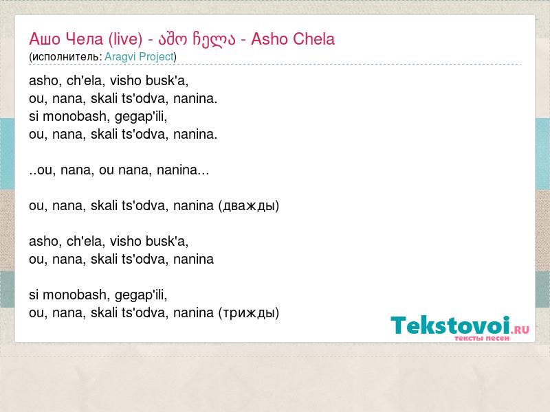 asho, ch'ela, visho busk'a, ou, nana, skali ts'odva, nanina. si monobash, gegap'ili, ou, nana, skali ts'odva, nanina. ..ou, nana, ou nana, nanina... ou, nana, skali ts'odva, nanina (дважды) asho, ch'ela, visho busk'a, ou, nana, skali ts'odva, nanina si monobash, gegap'ili, ou, nana, skali ts'odva, nanina (трижды)