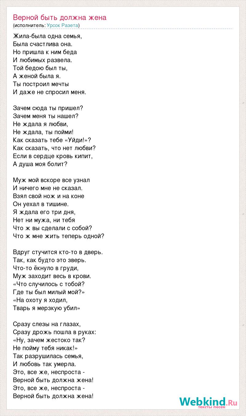 Жила-была одна семья, Была счастлива она. Но пришла к ним беда И любимых развела. Той бедою был ты, А женой была я. Ты построил мечты И даже не спросил меня. Зачем сюда ты пришел? Зачем меня ты нашел? Не ждала я любви, Не ждала, ты пойми! Как сказать тебе «Уйди!»? Как сказать, что нет любви? Если в сердце кровь кипит, А душа моя болит? Муж мой вскоре все узнал И ничего мне не сказал. Взял свой нож и на коне Он уехал в тишине. Я ждала его три дня, Нет ни мужа, ни тебя Что ж вы сделали с собой? Что ж мне жить теперь одной? Вдруг стучится кто-то в дверь. Так, как будто это зверь. Что-то ёкнуло в груди, Муж заходит весь в крови. «Что случилось с тобой? Где ты был милый мой?» «На охоту я ходил, Тварь я мерзкую убил» Сразу слезы на глазах, Сразу дрожь пошла в руках: «Ну, зачем жестоко так? Не пойму тебя никак!» Так разрушилась семья, И любовь так умерла. Это, все же, неспроста - Верной быть должна жена! Это, все же, неспроста - Верной быть должна жена!