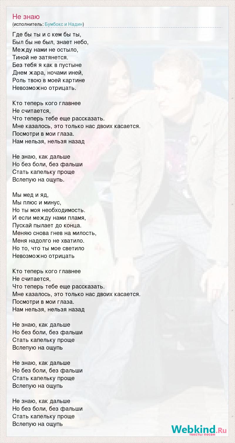 Где бы ты и с кем бы ты, Был бы не был, знает небо, Между нами не остыло, Тиной не затянется. Без тебя я как в пустыне Днем жара, ночами иней, Роль твою в моей картине Невозможно отрицать. Кто теперь кого главнее Не считается, Что теперь тебе еще рассказать. Мне казалось, это только нас двоих касается. Посмотри в мои глаза. Нам нельзя, нельзя назад Не знаю, как дальше Но без боли, без фальши Стать капельку проще Вслепую на ощупь. Мы мед и яд, Мы плюс и минус, Но ты моя необходимость. И если между нами пламя, Пускай пылает до конца. Меняю снова гнев на милость, Меня надолго не хватило. Но то, что ты мое светило Невозможно отрицать Кто теперь кого главнее Не считается, Что теперь тебе еще рассказать. Мне казалось, это только нас двоих касается. Посмотри в мои глаза. Нам нельзя, нельзя назад Не знаю, как дальше Но без боли, без фальши Стать капельку проще Вслепую на ощупь Не знаю, как дальше Но без боли, без фальши Стать капельку проще Вслепую на ощупь Не знаю, как дальше Но без боли, без фальши Стать капельку проще Вслепую на ощупь