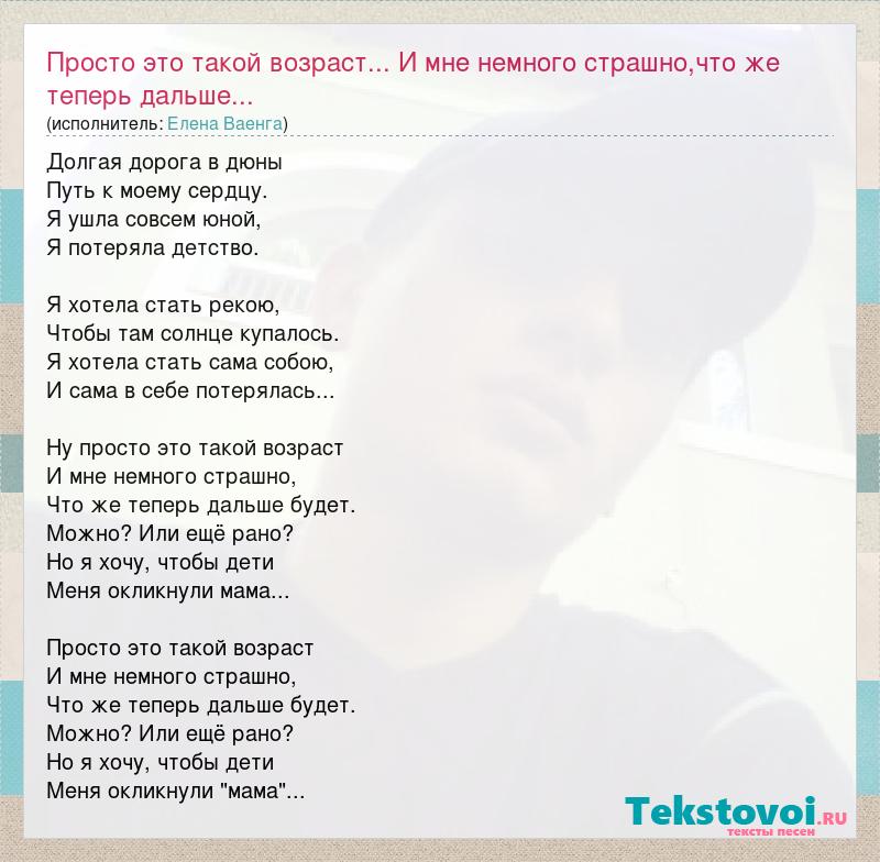 Главная→Исполнители→Елена Ваенга→Просто это такой возраст... И мне немного страшно,что же теперь дальше...