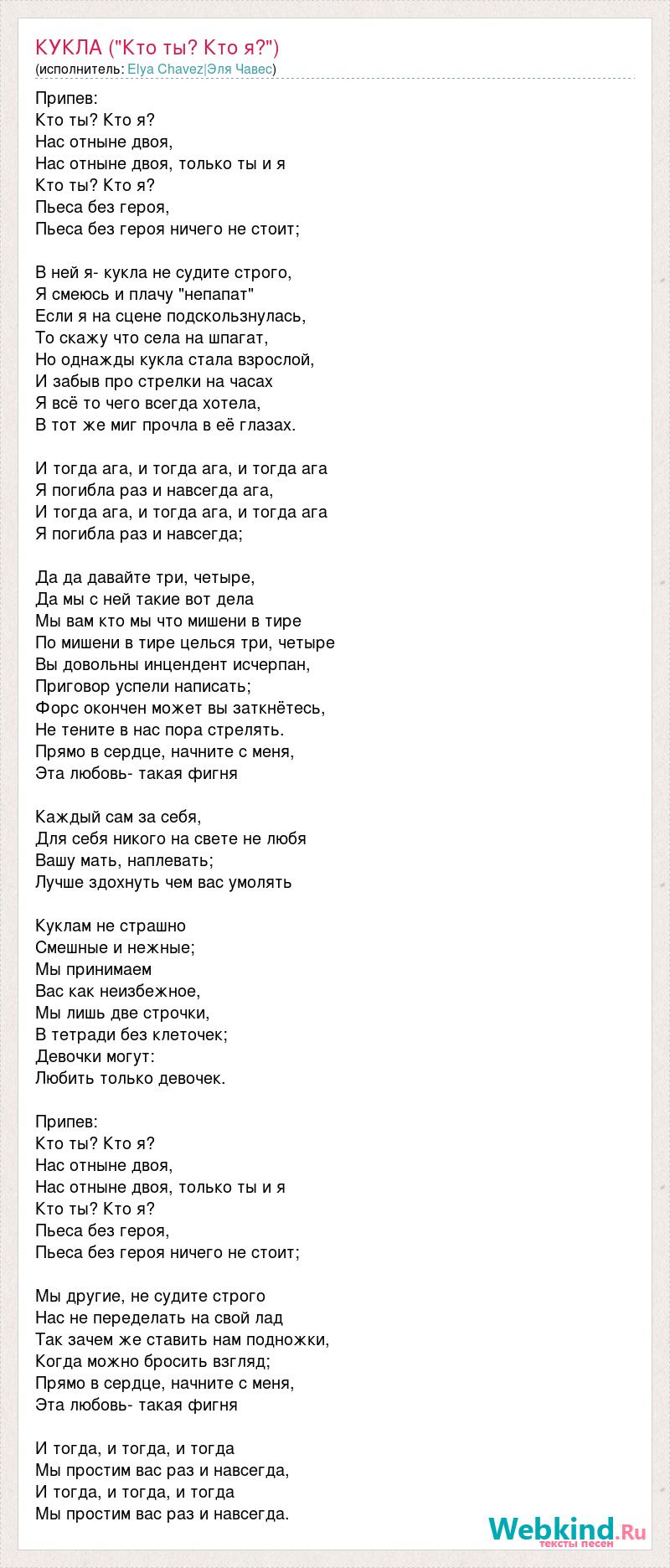 Припев: Кто ты? Кто я? Нас отныне двоя, Нас отныне двоя, только ты и я Кто ты? Кто я? Пьеса без героя, Пьеса без героя ничего не стоит; В ней я- кукла не судите строго, Я смеюсь и плачу "непапат" Если я на сцене подскользнулась, То скажу что села на шпагат, Но однажды кукла стала взрослой, И забыв про стрелки на часах Я всё то чего всегда хотела, В тот же миг прочла в её глазах. И тогда ага, и тогда ага, и тогда ага Я погибла раз и навсегда ага, И тогда ага, и тогда ага, и тогда ага Я погибла раз и навсегда; Да да давайте три, четыре, Да мы с ней такие вот дела Мы вам кто мы что мишени в тире По мишени в тире целься три, четыре Вы довольны инцендент исчерпан, Приговор успели написать; Форс окончен может вы заткнётесь, Не тените в нас пора стрелять. Прямо в сердце, начните с меня, Эта любовь- такая фигня Каждый сам за себя, Для себя никого на свете не любя Вашу мать, наплевать; Лучше здохнуть чем вас умолять Куклам не страшно Смешные и нежные; Мы принимаем Вас как неизбежное, Мы лишь две строчки, В тетради без клеточек; Девочки могут: Любить только девочек. Припев: Кто ты? Кто я? Нас отныне двоя, Нас отныне двоя, только ты и я Кто ты? Кто я? Пьеса без героя, Пьеса без героя ничего не стоит; Мы другие, не судите строго Нас не переделать на свой лад Так зачем же ставить нам подножки, Когда можно бросить взгляд; Прямо в сердце, начните с меня, Эта любовь- такая фигня И тогда, и тогда, и тогда Мы простим вас раз и навсегда, И тогда, и тогда, и тогда Мы простим вас раз и навсегда.