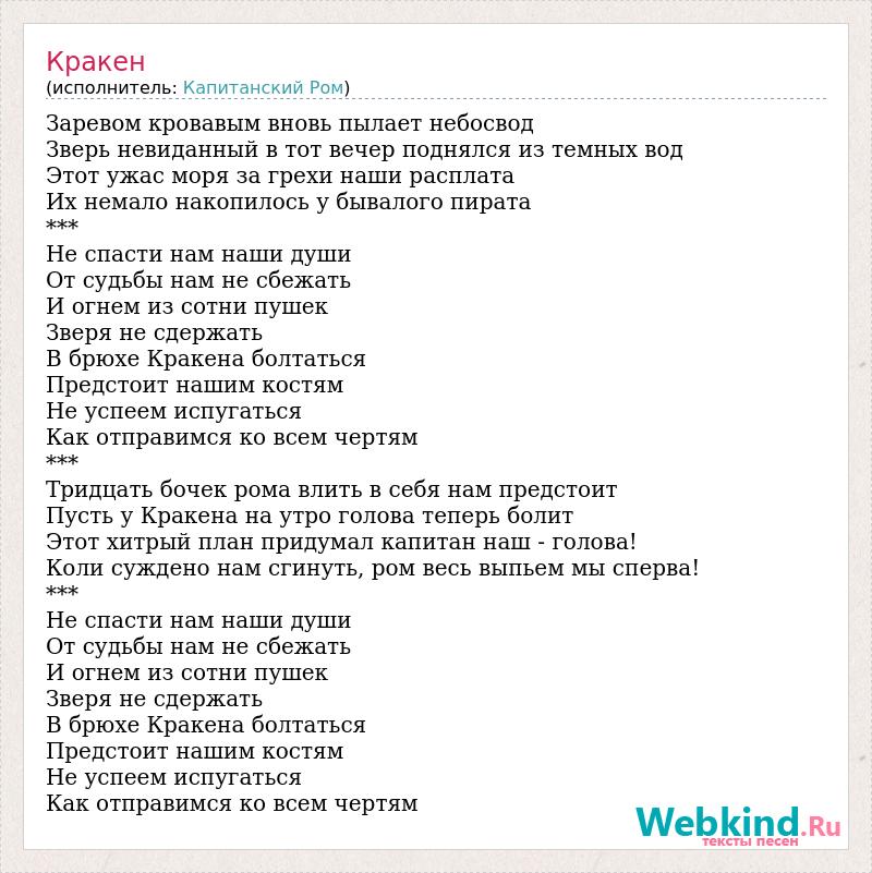 Заревом кровавым вновь пылает небосвод Зверь невиданный в тот вечер поднялся из темных вод Этот ужас моря за грехи наши расплата Их немало накопилось у бывалого пирата *** Не спасти нам наши души От судьбы нам не сбежать И огнем из сотни пушек Зверя не сдержать В брюхе Кракена болтаться Предстоит нашим костям Не успеем испугаться Как отправимся ко всем чертям *** Тридцать бочек рома влить в себя нам предстоит Пусть у Кракена на утро голова теперь болит Этот хитрый план придумал капитан наш - голова! Коли суждено нам сгинуть, ром весь выпьем мы сперва! *** Не спасти нам наши души От судьбы нам не сбежать И огнем из сотни пушек Зверя не сдержать В брюхе Кракена болтаться Предстоит нашим костям Не успеем испугаться Как отправимся ко всем чертям