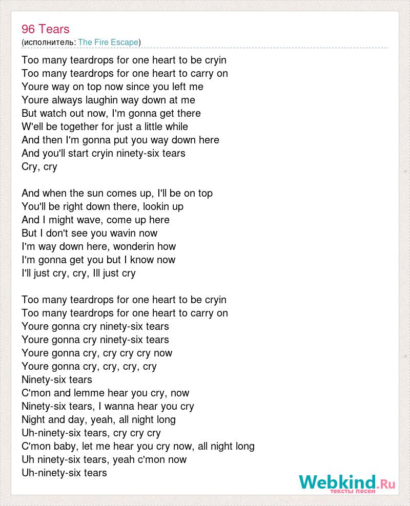 Too many teardrops for one heart to be cryin Too many teardrops for one heart to carry on Youre way on top now since you left me Youre always laughin way down at me But watch out now, I'm gonna get there W'ell be together for just a little while And then I'm gonna put you way down here And you'll start cryin ninety-six tears Cry, cry And when the sun comes up, I'll be on top You'll be right down there, lookin up And I might wave, come up here But I don't see you wavin now I'm way down here, wonderin how I'm gonna get you but I know now I'll just cry, cry, Ill just cry Too many teardrops for one heart to be cryin Too many teardrops for one heart to carry on Youre gonna cry ninety-six tears Youre gonna cry ninety-six tears Youre gonna cry, cry cry cry now Youre gonna cry, cry, cry, cry Ninety-six tears C'mon and lemme hear you cry, now Ninety-six tears, I wanna hear you cry Night and day, yeah, all night long Uh-ninety-six tears, cry cry cry C'mon baby, let me hear you cry now, all night long Uh ninety-six tears, yeah c'mon now Uh-ninety-six tears