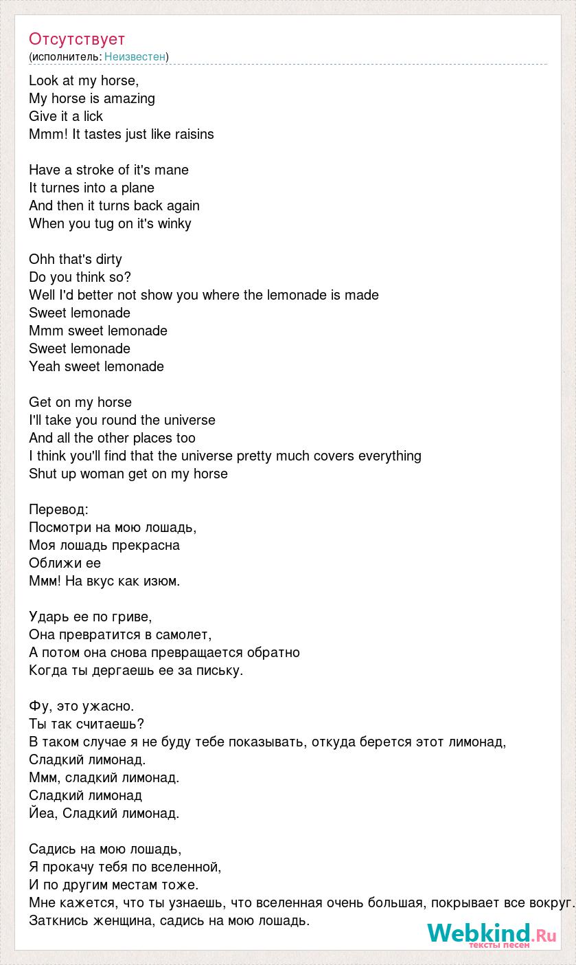 Look at my horse, My horse is amazing Give it a lick Mmm! It tastes just like raisins Have a stroke of it's mane It turnes into a plane And then it turns back again When you tug on it's winky Ohh that's dirty Do you think so? Well I'd better not show you where the lemonade is made Sweet lemonade Mmm sweet lemonade Sweet lemonade Yeah sweet lemonade Get on my horse I'll take you round the universe And all the other places too I think you'll find that the universe pretty much covers everything Shut up woman get on my horse Перевод: Посмотри на мою лошадь, Моя лошадь прекрасна Оближи ее Ммм! На вкус как изюм. Ударь ее по гриве, Она превратится в самолет, А потом она снова превращается обратно Когда ты дергаешь ее за письку. Фу, это ужасно. Ты так считаешь? В таком случае я не буду тебе показывать, откуда берется этот лимонад, Сладкий лимонад. Ммм, сладкий лимонад. Сладкий лимонад Йеа, Сладкий лимонад. Садись на мою лошадь, Я прокачу тебя по вселенной, И по другим местам тоже. Мне кажется, что ты узнаешь, что вселенная очень большая, покрывает все вокруг. Заткнись женщина, садись на мою лошадь.