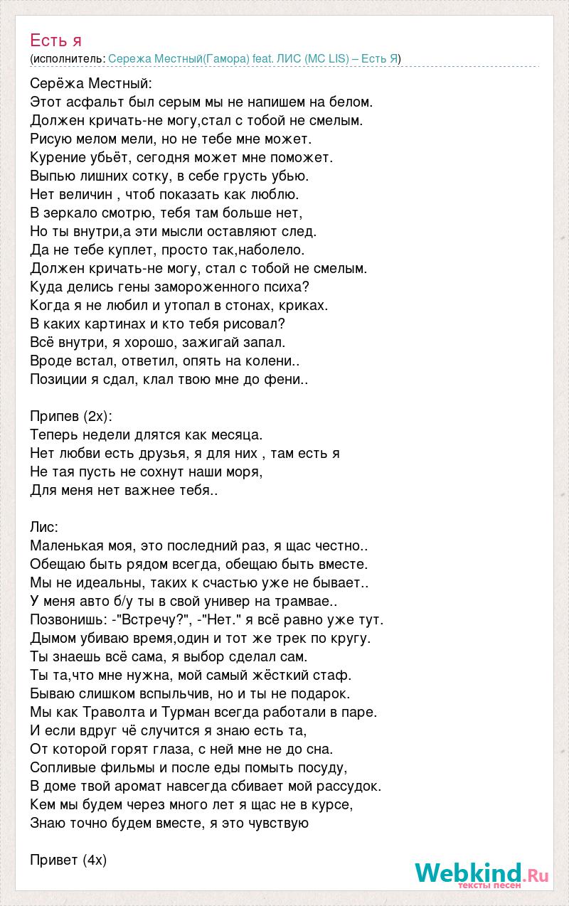 Серёжа Местный: Этот асфальт был серым мы не напишем на белом. Должен кричать-не могу,стал с тобой не смелым. Рисую мелом мели, но не тебе мне может. Курение убьёт, сегодня может мне поможет. Выпью лишних сотку, в себе грусть убью. Нет величин , чтоб показать как люблю. В зеркало смотрю, тебя там больше нет, Но ты внутри,а эти мысли оставляют след. Да не тебе куплет, просто так,наболело. Должен кричать-не могу, стал с тобой не смелым. Куда делись гены замороженного психа? Когда я не любил и утопал в стонах, криках. В каких картинах и кто тебя рисовал? Всё внутри, я хорошо, зажигай запал. Вроде встал, ответил, опять на колени.. Позиции я сдал, клал твою мне до фени.. Припев (2х): Теперь недели длятся как месяца. Нет любви есть друзья, я для них , там есть я Не тая пусть не сохнут наши моря, Для меня нет важнее тебя.. Лис: Маленькая моя, это последний раз, я щас честно.. Обещаю быть рядом всегда, обещаю быть вместе. Мы не идеальны, таких к счастью уже не бывает.. У меня авто б/у ты в свой универ на трамвае.. Позвонишь: -"Встречу?", -"Нет." я всё равно уже тут. Дымом убиваю время,один и тот же трек по кругу. Ты знаешь всё сама, я выбор сделал сам. Ты та,что мне нужна, мой самый жёсткий стаф. Бываю слишком вспыльчив, но и ты не подарок. Мы как Траволта и Турман всегда работали в паре. И если вдруг чё случится я знаю есть та, От которой горят глаза, с ней мне не до сна. Сопливые фильмы и после еды помыть посуду, В доме твой аромат навсегда сбивает мой рассудок. Кем мы будем через много лет я щас не в курсе, Знаю точно будем вместе, я это чувствую Привет (4х)