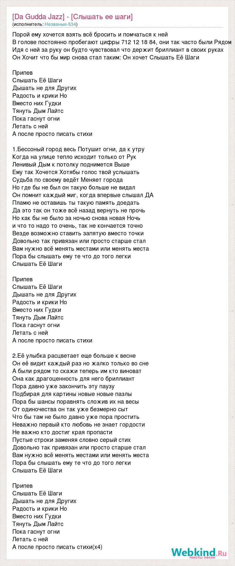 Порой ему хочется взять всё бросить и помчаться к ней В голове постоянно пробегают цифры 712 12 18 84, они так часто были Рядом Идя с ней за руку он будто чувствовал что держит бриллиант в своих руках Он Хочит что бы мир снова стал таким: Он хочет Слышать Её Шаги Припев Слышать Её Шаги Дышать не для Других Радость и крики Но Вместо них Гудки Тянуть Дым Лайтс Пока гаснут огни Летать с ней А после просто писать стихи 1.Бессоный город весь Потушит огни, да к утру Когда на улице тепло исходит только от Рук Ленивый Дым к потолку поднимется Выше Ему так Хочется Хотябы голос твой услышать Судьба по своему ведёт Меняет города Но где бы не был он такую больше не видал Он помнит каждый миг, когда впервые слышал ДА Пламю не оставишь ты такую память доедать Да это так он тоже всё назад вернуть не прочь Но как бы не было за ночью снова новая Ночь и что то надо то очень, так не кончается точно Везде возможно ставить запятую вместо точки Довольно так привязан или просто старше стал Вам нужно всё менять местами или менять места Пора бы слышать ему те что до того легки Слышать Её Шаги Припев Слышать Её Шаги Дышать не для Других Радость и крики Но Вместо них Гудки Тянуть Дым Лайтс Пока гаснут огни Летать с ней А после просто писать стихи 2.Её улыбка расцветает еще больше к весне Он её видит каждый раз но жалко только во сне А были рядом то скажи теперь им кто виноват Она как драгоценность для него бриллиант Пора давно уже закончить эту паузу Подбирая для картины новые новые пазлы Пора бы шансы поравнять сложив их на весы От одиночества он так уже безмерно сыт Что бы там не было давно уже пора простить Неважно первый кто любовь не знает гордости Не важно кто достиг края пропасти Пустые строки заменяя словно серый стих Довольно так привязан или просто старше стал Вам нужно всё менять местами или менять места Пора бы слышать ему те что до того легки Слышать Её Шаги Припев Слышать Её Шаги Дышать не для Других Радость и крики Но Вместо них Гудки Тянуть Дым Лайтс Пока гаснут огни Летать с ней А после просто писать стихи(х4)