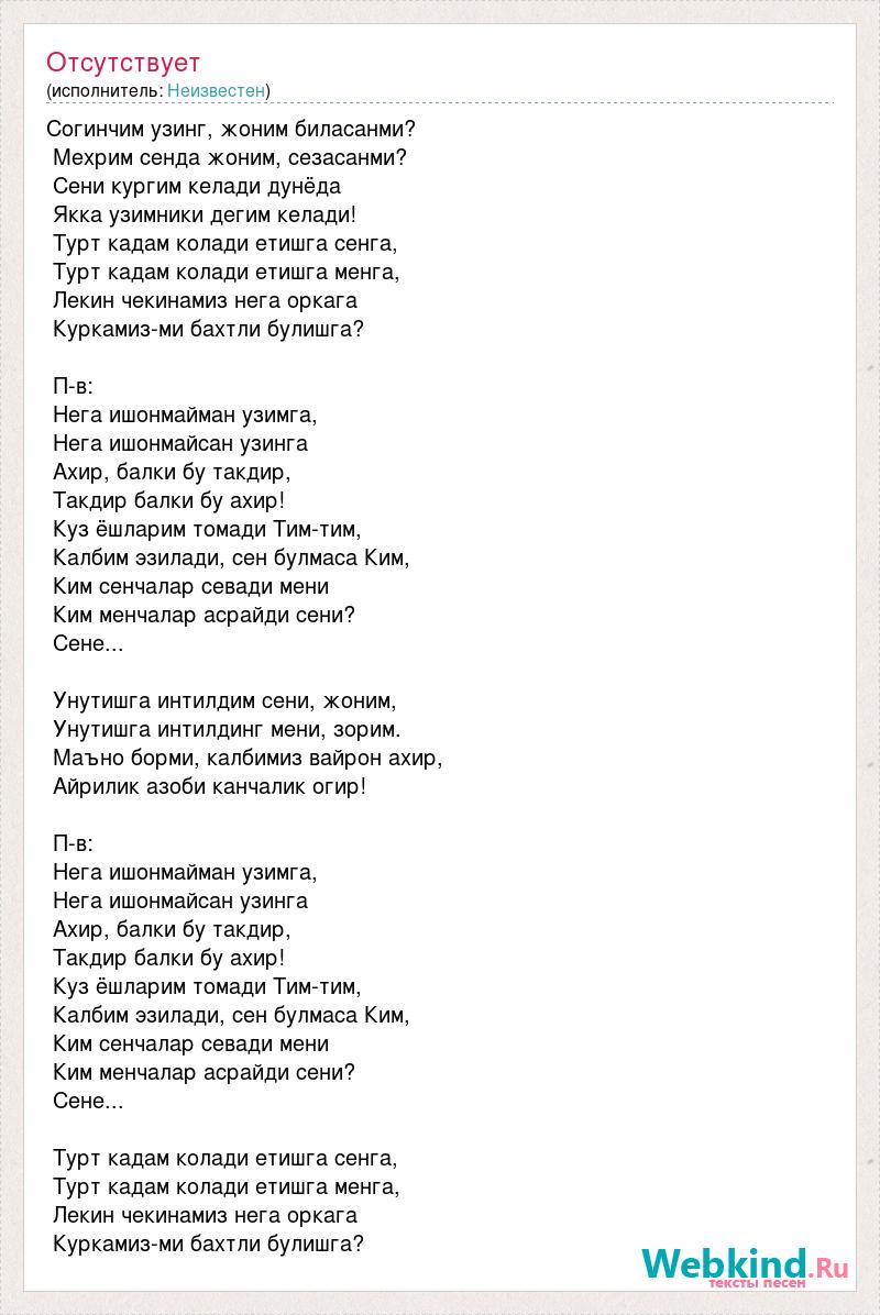 Согинчим узинг, жоним биласанми? Мехрим сенда жоним, сезасанми? Сени кургим келади дунёда Якка узимники дегим келади! Турт кадам колади етишга сенга, Турт кадам колади етишга менга, Лекин чекинамиз нега оркага Куркамиз-ми бахтли булишга? П-в: Нега ишонмайман узимга, Нега ишонмайсан узинга Ахир, балки бу такдир, Такдир балки бу ахир! Куз ёшларим томади Тим-тим, Калбим эзилади, сен булмаса Ким, Ким сенчалар севади мени Ким менчалар асрайди сени? Сене... Унутишга интилдим сени, жоним, Унутишга интилдинг мени, зорим. Маъно борми, калбимиз вайрон ахир, Айрилик азоби канчалик огир! П-в: Нега ишонмайман узимга, Нега ишонмайсан узинга Ахир, балки бу такдир, Такдир балки бу ахир! Куз ёшларим томади Тим-тим, Калбим эзилади, сен булмаса Ким, Ким сенчалар севади мени Ким менчалар асрайди сени? Сене... Турт кадам колади етишга сенга, Турт кадам колади етишга менга, Лекин чекинамиз нега оркага Куркамиз-ми бахтли булишга?