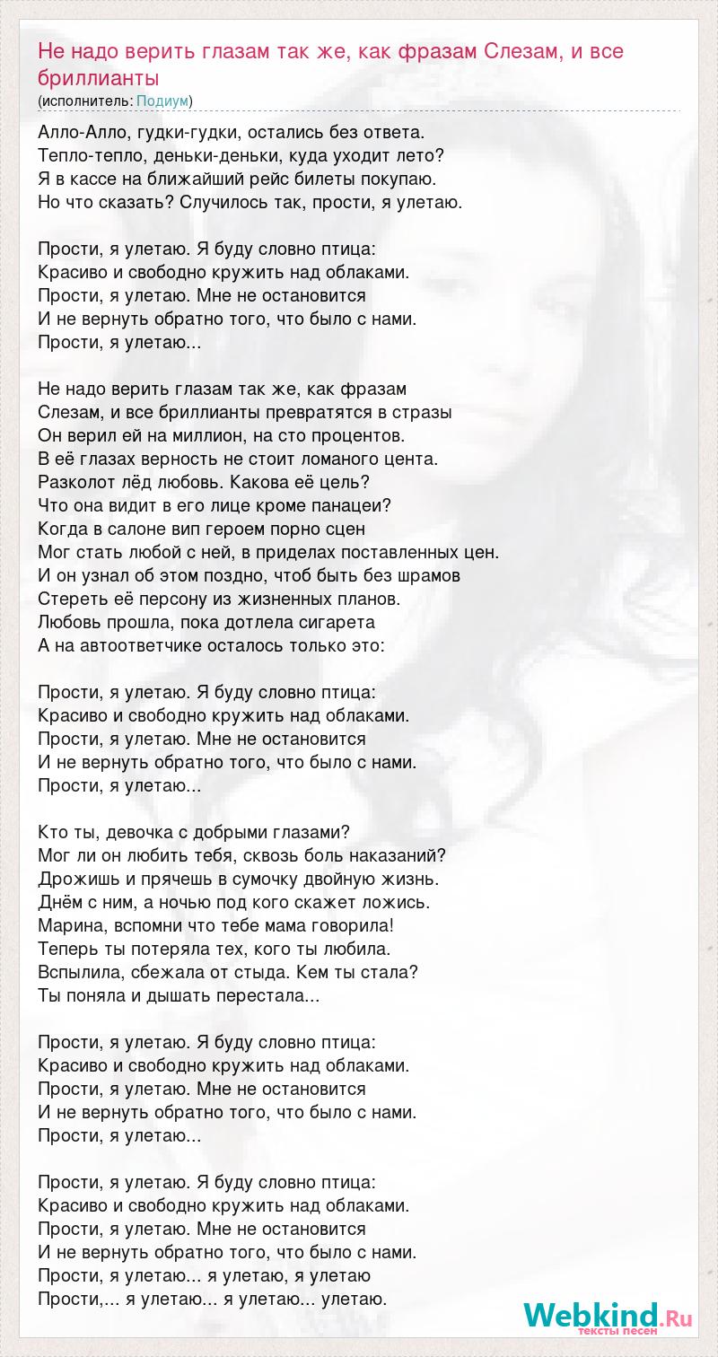 Алло-Алло, гудки-гудки, остались без ответа. Тепло-тепло, деньки-деньки, куда уходит лето? Я в кассе на ближайший рейс билеты покупаю. Но что сказать? Случилось так, прости, я улетаю. Прости, я улетаю. Я буду словно птица: Красиво и свободно кружить над облаками. Прости, я улетаю. Мне не остановится И не вернуть обратно того, что было с нами. Прости, я улетаю... Не надо верить глазам так же, как фразам Слезам, и все бриллианты превратятся в стразы Он верил ей на миллион, на сто процентов. В её глазах верность не стоит ломаного цента. Разколот лёд любовь. Какова её цель? Что она видит в его лице кроме панацеи? Когда в салоне вип героем порно сцен Мог стать любой с ней, в приделах поставленных цен. И он узнал об этом поздно, чтоб быть без шрамов Стереть её персону из жизненных планов. Любовь прошла, пока дотлела сигарета А на автоответчике осталось только это: Прости, я улетаю. Я буду словно птица: Красиво и свободно кружить над облаками. Прости, я улетаю. Мне не остановится И не вернуть обратно того, что было с нами. Прости, я улетаю... Кто ты, девочка с добрыми глазами? Мог ли он любить тебя, сквозь боль наказаний? Дрожишь и прячешь в сумочку двойную жизнь. Днём с ним, а ночью под кого скажет ложись. Марина, вспомни что тебе мама говорила! Теперь ты потеряла тех, кого ты любила. Вспылила, сбежала от стыда. Кем ты стала? Ты поняла и дышать перестала... Прости, я улетаю. Я буду словно птица: Красиво и свободно кружить над облаками. Прости, я улетаю. Мне не остановится И не вернуть обратно того, что было с нами. Прости, я улетаю... Прости, я улетаю. Я буду словно птица: Красиво и свободно кружить над облаками. Прости, я улетаю. Мне не остановится И не вернуть обратно того, что было с нами. Прости, я улетаю... я улетаю, я улетаю Прости,... я улетаю... я улетаю... улетаю.