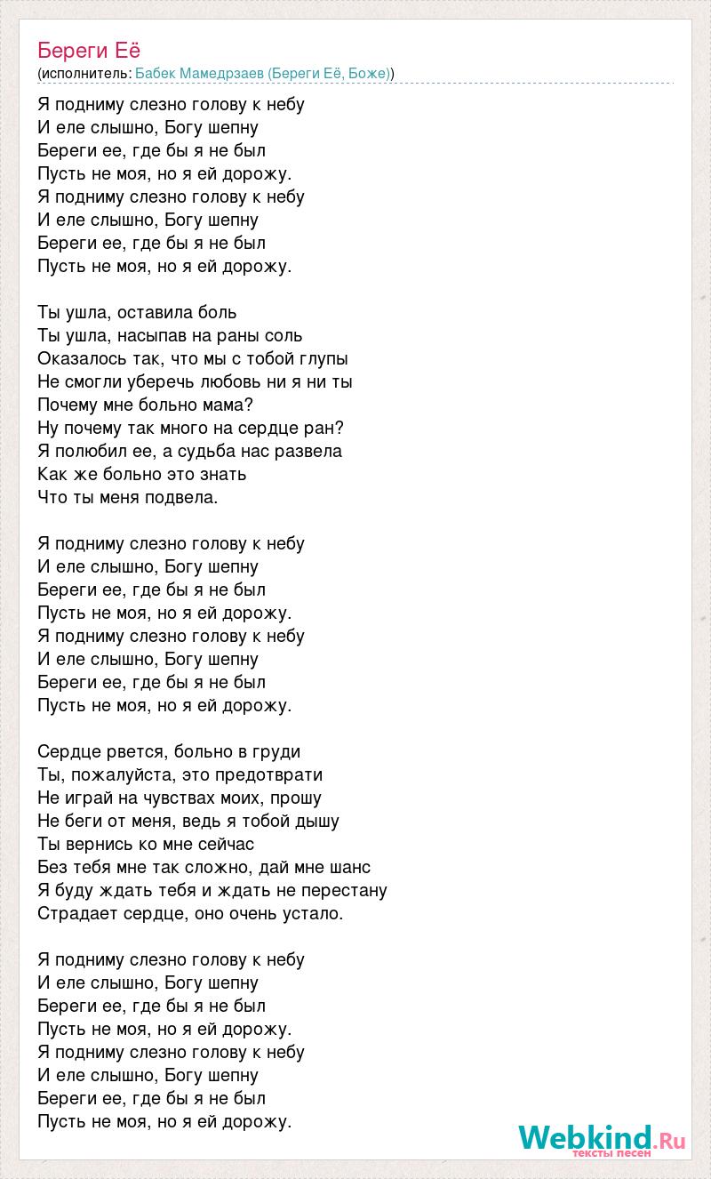 Я подниму слезно голову к небу И еле слышно, Богу шепну Береги ее, где бы я не был Пусть не моя, но я ей дорожу. Я подниму слезно голову к небу И еле слышно, Богу шепну Береги ее, где бы я не был Пусть не моя, но я ей дорожу. Ты ушла, оставила боль Ты ушла, насыпав на раны соль Оказалось так, что мы с тобой глупы Не смогли уберечь любовь ни я ни ты Почему мне больно мама? Ну почему так много на сердце ран? Я полюбил ее, а судьба нас развела Как же больно это знать Что ты меня подвела. Я подниму слезно голову к небу И еле слышно, Богу шепну Береги ее, где бы я не был Пусть не моя, но я ей дорожу. Я подниму слезно голову к небу И еле слышно, Богу шепну Береги ее, где бы я не был Пусть не моя, но я ей дорожу. Сердце рвется, больно в груди Ты, пожалуйста, это предотврати Не играй на чувствах моих, прошу Не беги от меня, ведь я тобой дышу Ты вернись ко мне сейчас Без тебя мне так сложно, дай мне шанс Я буду ждать тебя и ждать не перестану Страдает сердце, оно очень устало. Я подниму слезно голову к небу И еле слышно, Богу шепну Береги ее, где бы я не был Пусть не моя, но я ей дорожу. Я подниму слезно голову к небу И еле слышно, Богу шепну Береги ее, где бы я не был Пусть не моя, но я ей дорожу.