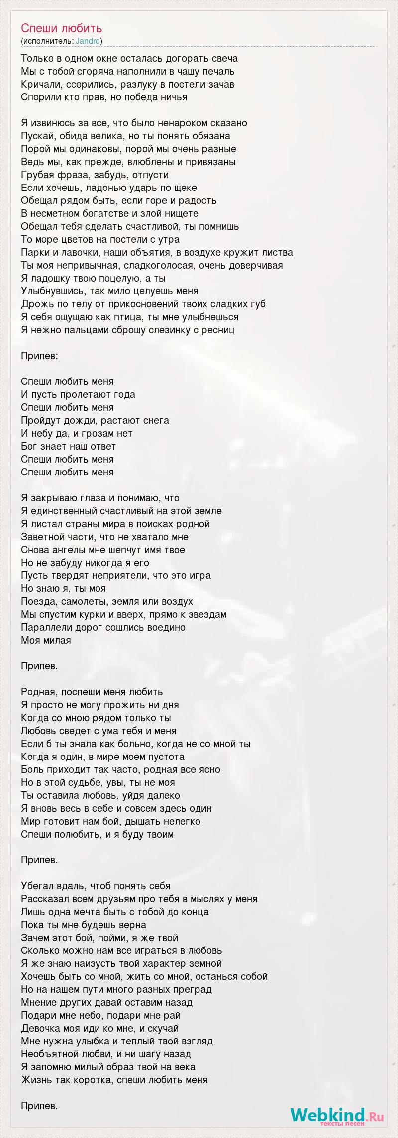 Только в одном окне осталась догорать свеча Мы с тобой сгоряча наполнили в чашу печаль Кричали, ссорились, разлуку в постели зачав Спорили кто прав, но победа ничья Я извинюсь за все, что было ненароком сказано Пускай, обида велика, но ты понять обязана Порой мы одинаковы, порой мы очень разные Ведь мы, как прежде, влюблены и привязаны Грубая фраза, забудь, отпусти Если хочешь, ладонью ударь по щеке Обещал рядом быть, если горе и радость В несметном богатстве и злой нищете Обещал тебя сделать счастливой, ты помнишь То море цветов на постели с утра Парки и лавочки, наши объятия, в воздухе кружит листва Ты моя непривычная, сладкоголосая, очень доверчивая Я ладошку твою поцелую, а ты Улыбнувшись, так мило целуешь меня Дрожь по телу от прикосновений твоих сладких губ Я себя ощущаю как птица, ты мне улыбнешься Я нежно пальцами сброшу слезинку с ресниц Припев: Спеши любить меня И пусть пролетают года Спеши любить меня Пройдут дожди, растают снега И небу да, и грозам нет Бог знает наш ответ Спеши любить меня Спеши любить меня Я закрываю глаза и понимаю, что Я единственный счастливый на этой земле Я листал страны мира в поисках родной Заветной части, что не хватало мне Снова ангелы мне шепчут имя твое Но не забуду никогда я его Пусть твердят неприятели, что это игра Но знаю я, ты моя Поезда, самолеты, земля или воздух Мы спустим курки и вверх, прямо к звездам Параллели дорог сошлись воедино Моя милая Припев. Родная, поспеши меня любить Я просто не могу прожить ни дня Когда со мною рядом только ты Любовь сведет с ума тебя и меня Если б ты знала как больно, когда не со мной ты Когда я один, в мире моем пустота Боль приходит так часто, родная все ясно Но в этой судьбе, увы, ты не моя Ты оставила любовь, уйдя далеко Я вновь весь в себе и совсем здесь один Мир готовит нам бой, дышать нелегко Спеши полюбить, и я буду твоим Припев. Убегал вдаль, чтоб понять себя Рассказал всем друзьям про тебя в мыслях у меня Лишь одна мечта быть с тобой до конца Пока ты мне будешь верна Зачем этот бой, пойми, я же твой Сколько можно нам все играться в любовь Я же знаю наизусть твой характер земной Хочешь быть со мной, жить со мной, останься собой Но на нашем пути много разных преград Мнение других давай оставим назад Подари мне небо, подари мне рай Девочка моя иди ко мне, и скучай Мне нужна улыбка и теплый твой взгляд Необъятной любви, и ни шагу назад Я запомню милый образ твой на века Жизнь так коротка, спеши любить меня Припев.