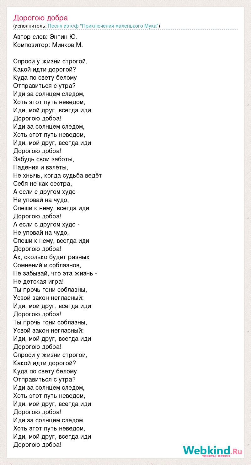 Автор слов: Энтин Ю. Композитор: Минков М. Спроси у жизни строгой, Какой идти дорогой? Куда по свету белому Отправиться с утра? Иди за солнцем следом, Хоть этот путь неведом, Иди, мой друг, всегда иди Дорогою добра! Иди за солнцем следом, Хоть этот путь неведом, Иди, мой друг, всегда иди Дорогою добра! Забудь свои заботы, Падения и взлёты, Не хнычь, когда судьба ведёт Себя не как сестра, А если с другом худо - Не уповай на чудо, Спеши к нему, всегда иди Дорогою добра! А если с другом худо - Не уповай на чудо, Спеши к нему, всегда иди Дорогою добра! Ах, сколько будет разных Сомнений и соблазнов, Не забывай, что эта жизнь - Не детская игра! Ты прочь гони соблазны, Усвой закон негласный: Иди, мой друг, всегда иди Дорогою добра! Ты прочь гони соблазны, Усвой закон негласный: Иди, мой друг, всегда иди Дорогою добра! Спроси у жизни строгой, Какой идти дорогой? Куда по свету белому Отправиться с утра? Иди за солнцем следом, Хоть этот путь неведом, Иди, мой друг, всегда иди Дорогою добра! Иди за солнцем следом, Хоть этот путь неведом, Иди, мой друг, всегда иди Дорогою добра!