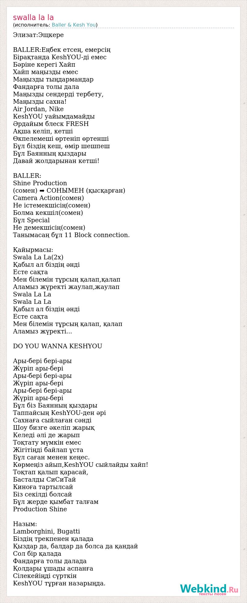 Элизат:Эщкере BALLER:Еңбек етсең, емерсің Бiрақтанда KeshYOU-ді емес Бәріне керегі Хайп Хайп маңызды емес Маңызды тыңдармандар Фандарға толы дала Маңызды сендерді тербету, Маңызды саxна! Air Jordan, Nike КеshYOU уайымдамайды Әрдайым блеск FRESH Ақша келіп, кетші Өкпелемеші өртеніп өртенші Бұл біздің кеш, өмiр шешпеш Бұл Баянның қыздары Давай жолдарынан кетші! BALLER: Shine Production (сомен) ➡ СОНЫМЕН (қысқарған) Camera Action(сомен) Не істемекшісің(сомен) Болма кекшіл(сомен) Бұл Special Не демекшісің(сомен) Танымасаң бұл 11 Block connection. Қайырмасы: Swala La La(2x) Қабыл ал біздің әнді Есте сақта Мен білемін тұрсың қалап,қалап Аламыз жүректі жаулап,жаулап Swala La La Swala La La Қабыл ал біздің әнді Есте сақта Мен білемін тұрсың қалап, қалап Аламыз жүректі... DO YOU WANNA KESHYOU Ары-бері бері-ары Жүріп ары-бері Ары-бері бері-ары Жүріп ары-бері Ары-бері бері-ары Жүріп ары-бері Бұл бiз Баянның қыздары Таппайсың KeshYOU-ден әрі Саxнаға сыйлаған сәнді Шоу бизге әкеліп жарық Келеді әлі де жарып Тоқтату мүмкін емес Жігітіңді байлап ұста Бұл саған менен кеңес. Көрмеңіз айып,KeshYOU сыйлайды xайп! Тоқтап қалып қарасай, Басталды СиСиТай Киноға тартылсай Біз секілді болсай Бұл жерде қымбат талғам Production Shine Назым: Lamborghini, Bugatti Біздiң трекпенен қалада Қыздар да, балдар да болса да қандай Сол бір қалада Фандарға толы далада Қолдары ұшады аспанға Сілекейіңді сүрткін KeshYOU тұрған назарыңда.