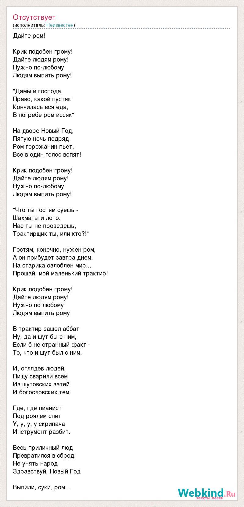 Дайте ром! Крик подобен грому! Дайте людям рому! Нужно по-любому Людям выпить рому! "Дамы и господа, Право, какой пустяк! Кончилась вся еда, В погребе ром иссяк" На дворе Новый Год, Пятую ночь подряд Ром горожанин пьет, Все в один голос вопят! Крик подобен грому! Дайте людям рому! Нужно по-любому Людям выпить рому! "Что ты гостям суешь - Шахматы и лото. Нас ты не проведешь, Трактирщик ты, или кто?!" Гостям, конечно, нужен ром, А он прибудет завтра днем. На старика озлоблен мир... Прощай, мой маленький трактир! Крик подобен грому! Дайте людям рому! Нужно по любому Людям выпить рому В трактир зашел аббат Ну, да и шут бы с ним, Если б не странный факт - То, что и шут был с ним. И, оглядев людей, Пищу сварили всем Из шутовских затей И богословских тем. Где, где пианист Под роялем спит У, у, у, у скрипача Инструмент разбит. Весь приличный люд Превратился в сброд. Не унять народ Здравствуй, Новый Год Выпили, суки, ром...