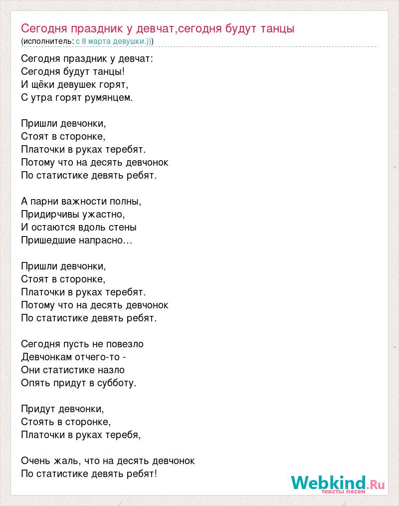 Сегодня праздник у девчат: Сегодня будут танцы! И щёки девушек горят, С утра горят румянцем. Пришли девчонки, Стоят в сторонке, Платочки в руках теребят. Потому что на десять девчонок По статистике девять ребят. А парни важности полны, Придирчивы ужастно, И остаются вдоль стены Пришедшие напрасно… Пришли девчонки, Стоят в сторонке, Платочки в руках теребят. Потому что на десять девчонок По статистике девять ребят. Сегодня пусть не повезло Девчонкам отчего-то - Они статистике назло Опять придут в субботу. Придут девчонки, Стоять в сторонке, Платочки в руках теребя, Очень жаль, что на десять девчонок По статистике девять ребят!