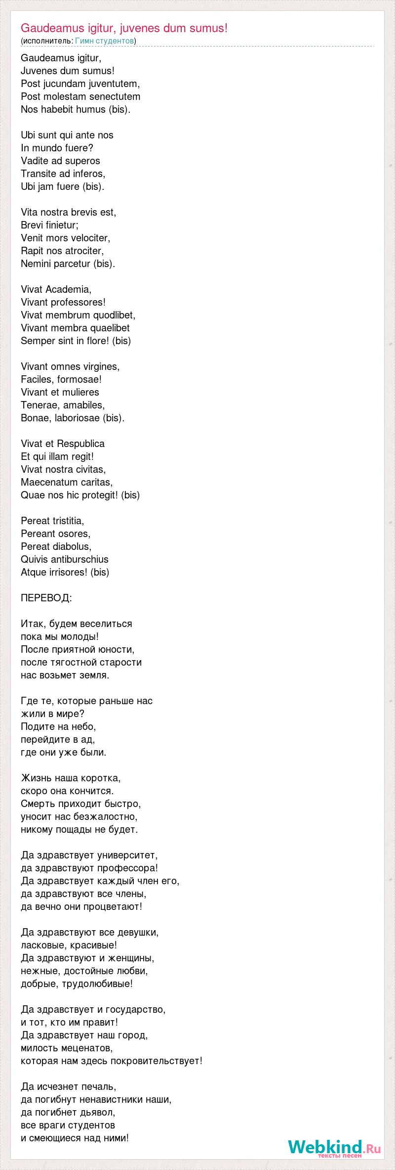 Gaudeamus igitur, Juvenes dum sumus! Post jucundam juventutem, Post molestam senectutem Nos habebit humus (bis). Ubi sunt qui ante nos In mundo fuere? Vadite ad superos Transite ad inferos, Ubi jam fuere (bis). Vita nostra brevis est, Brevi finietur; Venit mors velociter, Rapit nos atrociter, Nemini parcetur (bis). Vivat Academia, Vivant professores! Vivat membrum quodlibet, Vivant membra quaelibet Semper sint in flore! (bis) Vivant omnes virgines, Faciles, formosae! Vivant et mulieres Tenerae, amabiles, Bonae, laboriosae (bis). Vivat et Respublica Et qui illam regit! Vivat nostra civitas, Maecenatum caritas, Quae nos hic protegit! (bis) Pereat tristitia, Pereant osores, Pereat diabolus, Quivis antiburschius Atque irrisores! (bis) ПЕРЕВОД: Итак, будем веселиться пока мы молоды! После приятной юности, после тягостной старости нас возьмет земля. Где те, которые раньше нас жили в мире? Подите на небо, перейдите в ад, где они уже были. Жизнь наша коротка, скоро она кончится. Смерть приходит быстро, уносит нас безжалостно, никому пощады не будет. Да здравствует университет, да здравствуют профессора! Да здравствует каждый член его, да здравствуют все члены, да вечно они процветают! Да здравствуют все девушки, ласковые, красивые! Да здравствуют и женщины, нежные, достойные любви, добрые, трудолюбивые! Да здравствует и государство, и тот, кто им правит! Да здравствует наш город, милость меценатов, которая нам здесь покровительствует! Да исчезнет печаль, да погибнут ненавистники наши, да погибнет дьявол, все враги студентов и смеющиеся над ними!