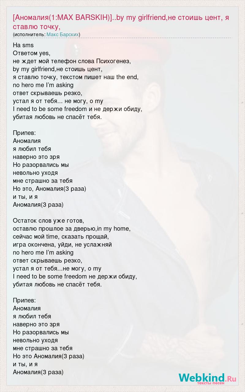 А как ты думаешь, о чем песня "[Аномалия(1:MAX BARSKIH)]..by my girlfriend,не стоишь цент, я ставлю точку, тек" ?
