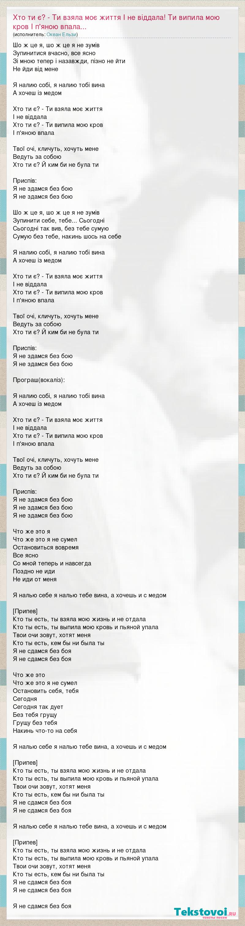 Шо ж це я, шо ж це я не зумів Зупинитися вчасно, все ясно Зі мною тепер і назавжди, пізно не йти Не йди від мене Я налию собі, я налию тобі вина А хочеш із медом Хто ти є? - Ти взяла моє життя І не віддала Хто ти є? - Ти випила мою кров І п'яною впала Твої очі, кличуть, хочуть мене Ведуть за собою Хто ти є? Й ким би не була ти Приспів: Я не здамся без бою Я не здамся без бою Шо ж це я, шо ж це я не зумів Зупинити себе, тебе... Сьогодні Сьогодні так вив, без тебе сумую Сумую без тебе, накинь шось на себе Я налию собі, я налию тобі вина А хочеш із медом Хто ти є? - Ти взяла моє життя І не віддала Хто ти є? - Ти випила мою кров І п'яною впала Твої очі, кличуть, хочуть мене Ведуть за собою Хто ти є? Й ким би не була ти Приспів: Я не здамся без бою Я не здамся без бою Програш(вокаліз): Я налию собі, я налию тобі вина А хочеш із медом Хто ти є? - Ти взяла моє життя І не віддала Хто ти є? - Ти випила мою кров І п'яною впала Твої очі, кличуть, хочуть мене Ведуть за собою Хто ти є? Й ким би не була ти Приспів: Я не здамся без бою Я не здамся без бою Я не здамся без бою Что же это я Что же это я не сумел Остановиться вовремя Все ясно Со мной теперь и навсегда Поздно не иди Не иди от меня Я налью себе я налью тебе вина, а хочешь и с медом [Припев] Кто ты есть, ты взяла мою жизнь и не отдала Кто ты есть, ты выпила мою кровь и пьяной упала Твои очи зовут, хотят меня Кто ты есть, кем бы ни была ты Я не сдамся без боя Я не сдамся без боя Что же это Что же это я не сумел Остановить себя, тебя Сегодня Сегодня так дует Без тебя грущу Грущу без тебя Накинь что-то на себя Я налью себе я налью тебе вина, а хочешь и с медом [Припев] Кто ты есть, ты взяла мою жизнь и не отдала Кто ты есть, ты выпила мою кровь и пьяной упала Твои очи зовут, хотят меня Кто ты есть, кем бы ни была ты Я не сдамся без боя Я не сдамся без боя Я налью себе я налью тебе вина, а хочешь и с медом [Припев] Кто ты есть, ты взяла мою жизнь и не отдала Кто ты есть, ты выпила мою кровь и пьяной упала Твои очи зовут, хотят меня Кто ты есть, кем бы ни была ты Я не сдамся без боя Я не сдамся без боя Я не сдамся без боя