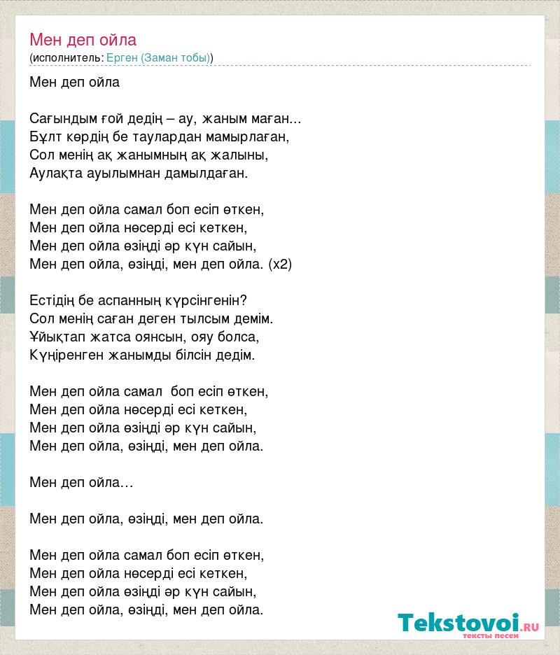 Мен деп ойла Сағындым ғой дедің – ау, жаным маған... Бұлт көрдің бе таулардан мамырлаған, Сол менің ақ жанымның ақ жалыны, Аулақта ауылымнан дамылдаған. Мен деп ойла самал боп есiп өткен, Мен деп ойла нөсердi есi кеткен, Мен деп ойла өзіңді әр күн сайын, Мен деп ойла, өзіңді, мен деп ойла. (х2) Естідің бе аспанның күрсінгенін? Сол менің саған деген тылсым демім. Ұйықтап жатса оянсын, ояу болса, Күңіренген жанымды білсін дедім. Мен деп ойла самал боп есiп өткен, Мен деп ойла нөсердi есi кеткен, Мен деп ойла өзіңді әр күн сайын, Мен деп ойла, өзіңді, мен деп ойла. Мен деп ойла… Мен деп ойла, өзіңді, мен деп ойла. Мен деп ойла самал боп есiп өткен, Мен деп ойла нөсердi есi кеткен, Мен деп ойла өзіңді әр күн сайын, Мен деп ойла, өзіңді, мен деп ойла.
