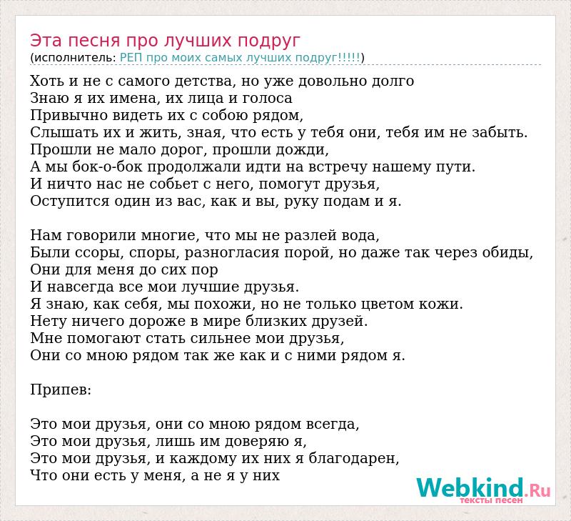 Хоть и не с самого детства, но уже довольно долго Знаю я их имена, их лица и голоса Привычно видеть их с собою рядом, Слышать их и жить, зная, что есть у тебя они, тебя им не забыть. Прошли не мало дорог, прошли дожди, А мы бок-о-бок продолжали идти на встречу нашему пути. И ничто нас не собьет с него, помогут друзья, Оступится один из вас, как и вы, руку подам и я. Нам говорили многие, что мы не разлей вода, Были ссоры, споры, разногласия порой, но даже так через обиды, Они для меня до сих пор И навсегда все мои лучшие друзья. Я знаю, как себя, мы похожи, но не только цветом кожи. Нету ничего дороже в мире близких друзей. Мне помогают стать сильнее мои друзья, Они со мною рядом так же как и с ними рядом я. Припев: Это мои друзья, они со мною рядом всегда, Это мои друзья, лишь им доверяю я, Это мои друзья, и каждому их них я благодарен, Что они есть у меня, а не я у них