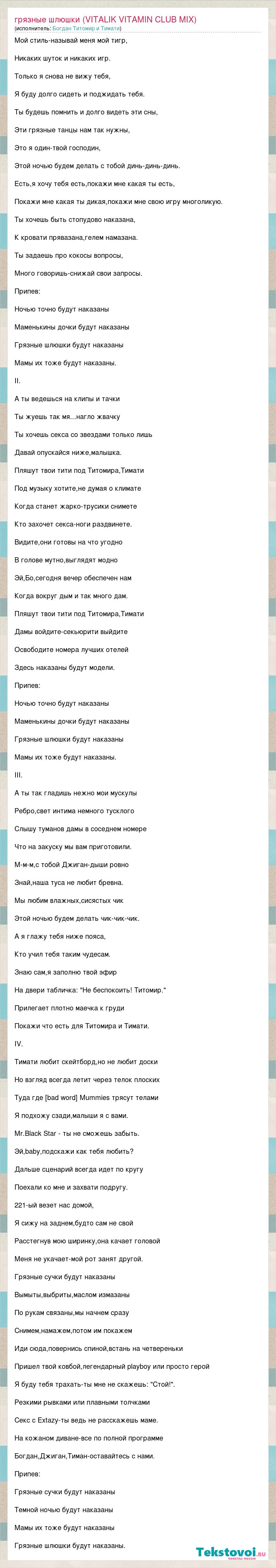 Мой стиль-называй меня мой тигр, Никаких шуток и никаких игр. Только я снова не вижу тебя, Я буду долго сидеть и поджидать тебя. Ты будешь помнить и долго видеть эти сны, Эти грязные танцы нам так нужны, Это я один-твой господин, Этой ночью будем делать с тобой динь-динь-динь. Есть,я хочу тебя есть,покажи мне какая ты есть, Покажи мне какая ты дикая,покажи мне свою игру многоликую. Ты хочешь быть стопудово наказана, К кровати прявазана,гелем намазана. Ты задаешь про кокосы вопросы, Много говоришь-снижай свои запросы. Припев: Ночью точно будут наказаны Маменькины дочки будут наказаны Грязные шлюшки будут наказаны Мамы их тоже будут наказаны. II. А ты ведешься на клипы и тачки Ты жуешь так мя...нагло жвачку Ты хочешь секса со звездами только лишь Давай опускайся ниже,малышка. Пляшут твои тити под Титомира,Тимати Под музыку хотите,не думая о климате Когда станет жарко-трусики снимете Кто захочет секса-ноги раздвинете. Видите,они готовы на что угодно В голове мутно,выглядят модно Эй,Бо,сегодня вечер обеспечен нам Когда вокруг дым и так много дам. Пляшут твои тити под Титомира,Тимати Дамы войдите-секьюрити выйдите Освободите номера лучших отелей Здесь наказаны будут модели. Припев: Ночью точно будут наказаны Маменькины дочки будут наказаны Грязные шлюшки будут наказаны Мамы их тоже будут наказаны. III. А ты так гладишь нежно мои мускулы Ребро,свет интима немного тусклого Слышу туманов дамы в соседнем номере Что на закуску мы вам приготовили. М-м-м,с тобой Джиган-дыши ровно Знай,наша туса не любит бревна. Мы любим влажных,сисястых чик Этой ночью будем делать чик-чик-чик. А я глажу тебя ниже пояса, Кто учил тебя таким чудесам. Знаю сам,я заполню твой эфир На двери табличка: "Не беспокоить! Титомир." Прилегает плотно маечка к груди Покажи что есть для Титомира и Тимати. IV. Тимати любит скейтборд,но не любит доски Но взгляд всегда летит через телок плоских Туда где [bad word] Mummies трясут телами Я подхожу сзади,малыши я с вами. Mr.Black Star - ты не сможешь забыть. Эй,baby,подскажи как тебя любить? Дальше сценарий всегда идет по кругу Поехали ко мне и захвати подругу. 221-ый везет нас домой, Я сижу на заднем,будто сам не свой Расстегнув мою ширинку,она качает головой Меня не укачает-мой рот занят другой. Грязные сучки будут наказаны Вымыты,выбриты,маслом измазаны По рукам связаны,мы начнем сразу Снимем,намажем,потом им покажем Иди сюда,повернись спиной,встань на четвереньки Пришел твой ковбой,легендарный playboy или просто герой Я буду тебя трахать-ты мне не скажешь: "Стой!". Резкими рывками или плавными толчками Секс с Extazy-ты ведь не расскажешь маме. На кожаном диване-все по полной программе Богдан,Джиган,Тиман-оставайтесь с нами. Припев: Грязные сучки будут наказаны Темной ночью будут наказаны Мамы их тоже будут наказаны Грязные шлюшки будут наказаны.