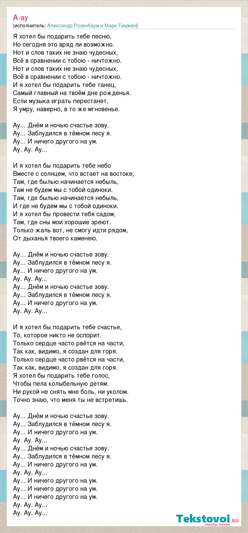 Я хотел бы подарить тебе песню, Но сегодня это вряд ли возможно. Нот и слов таких не знаю чудесных, Всё в сравнении с тобою - ничтожно. Нот и слов таких не знаю чудесных, Всё в сравнении с тобою - ничтожно. И я хотел бы подарить тебе танец, Самый главный на твоём дне рожденья. Если музыка играть перестанет, Я умру, наверно, в то же мгновенье. Ау... Днём и ночью счастье зову. Ау... Заблудился в тёмном лесу я. Ау... И ничего другого на ум. Ау. Ау. Ау... И я хотел бы подарить тебе небо Вместе с солнцем, что встает на востоке, Там, где былью начинается небыль, Там не будем мы с тобой одиноки. Там, где былью начинается небыль, И где не будем мы с тобой одиноки. И я хотел бы провести тебя садом, Там, где сны мои хорошие зреют. Только жаль вот, не смогу идти рядом, От дыханья твоего каменею. Ау... Днём и ночью счастье зову. Ау... Заблудился в тёмном лесу я. Ау... И ничего другого на ум. Ау. Ау. Ау... Ау... Днём и ночью счастье зову. Ау... Заблудился в тёмном лесу я. Ау... И ничего другого на ум. Ау. Ау. Ау... И я хотел бы подарить тебе счастье, То, которое никто не оспорит. Только сердце часто рвётся на части, Так как, видимо, я создан для горя. Только сердце часто рвётся на части, Так как, видимо, я создан для горя. Я хотел бы подарить тебе голос, Чтобы пела колыбельную детям. Ни рукой не снять мне боль, ни уколом. Точно знаю, что меня ты не встретишь. Ау... Днём и ночью счастье зову. Ау... Заблудился в тёмном лесу я. Ау... И ничего другого на ум. Ау. Ау. Ау... Ау... Днём и ночью счастье зову. Ау... Заблудился в тёмном лесу я. Ау... И ничего другого на ум. Ау. Ау. Ау... Ау... И ничего другого на ум. Ау... И ничего другого на ум. Ау... И ничего другого на ум. Ау. Ау. Ау... Ау. Ау. Ау...