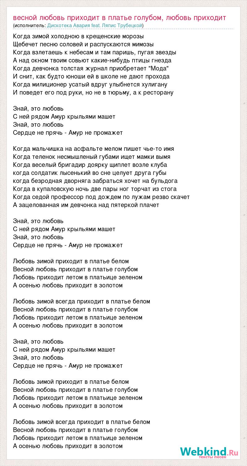 Главная→Исполнители→Дискотека Авария feat. Ляпис Трубецкой→Весной любовь приходит в платье голубом, любовь приходит летом в платьице