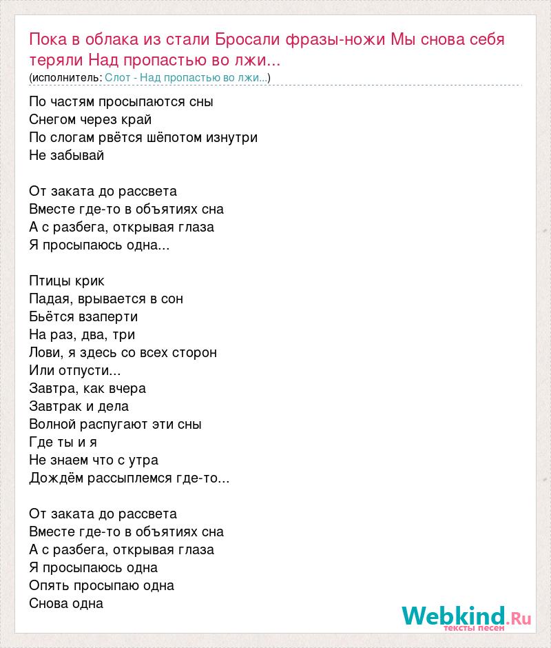 Главная→Исполнители→Слот - Над пропастью во лжи...→Пока в облака из стали Бросали фразы-ножи Мы снова себя теряли Над пропасть