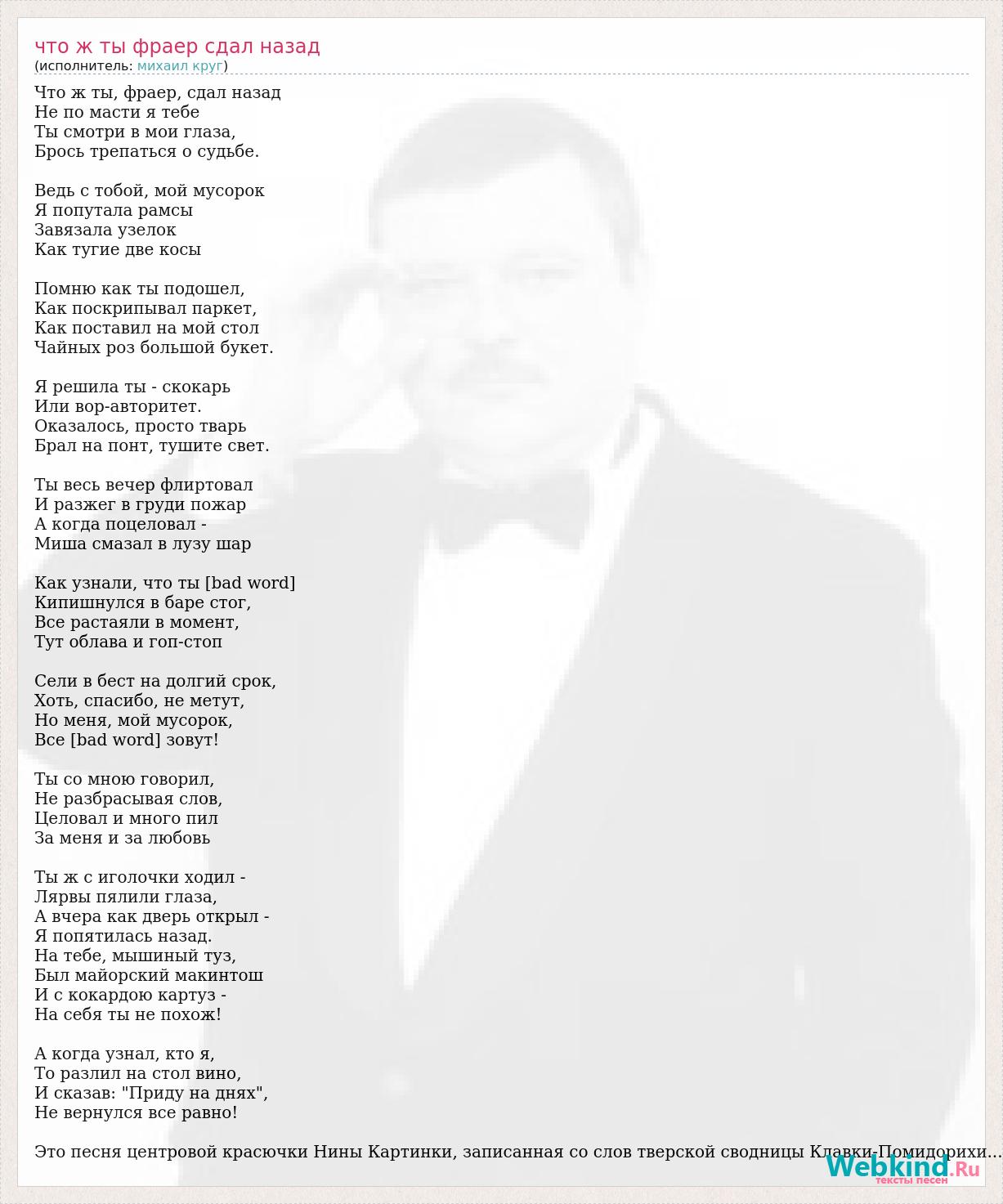 Что ж ты, фраер, сдал назад Не по масти я тебе Ты смотри в мои глаза, Брось трепаться о судьбе. Ведь с тобой, мой мусорок Я попутала рамсы Завязала узелок Как тугие две косы Помню как ты подошел, Как поскрипывал паркет, Как поставил на мой стол Чайных роз большой букет. Я решила ты - скокарь Или вор-авторитет. Оказалось, просто тварь Брал на понт, тушите свет. Ты весь вечер флиртовал И разжег в груди пожар А когда поцеловал - Миша смазал в лузу шар Как узнали, что ты [bad word] Кипишнулся в баре стог, Все растаяли в момент, Тут облава и гоп-стоп Сели в бест на долгий срок, Хоть, спасибо, не метут, Но меня, мой мусорок, Все [bad word] зовут! Ты со мною говорил, Не разбрасывая слов, Целовал и много пил За меня и за любовь Ты ж с иголочки ходил - Лярвы пялили глаза, А вчера как дверь открыл - Я попятилась назад. На тебе, мышиный туз, Был майорский макинтош И с кокардою картуз - На себя ты не похож! А когда узнал, кто я, То разлил на стол вино, И сказав: "Приду на днях", Не вернулся все равно! Это песня центровой красючки Нины Картинки, записанная со слов тверской сводницы Клавки-Помидорихи...