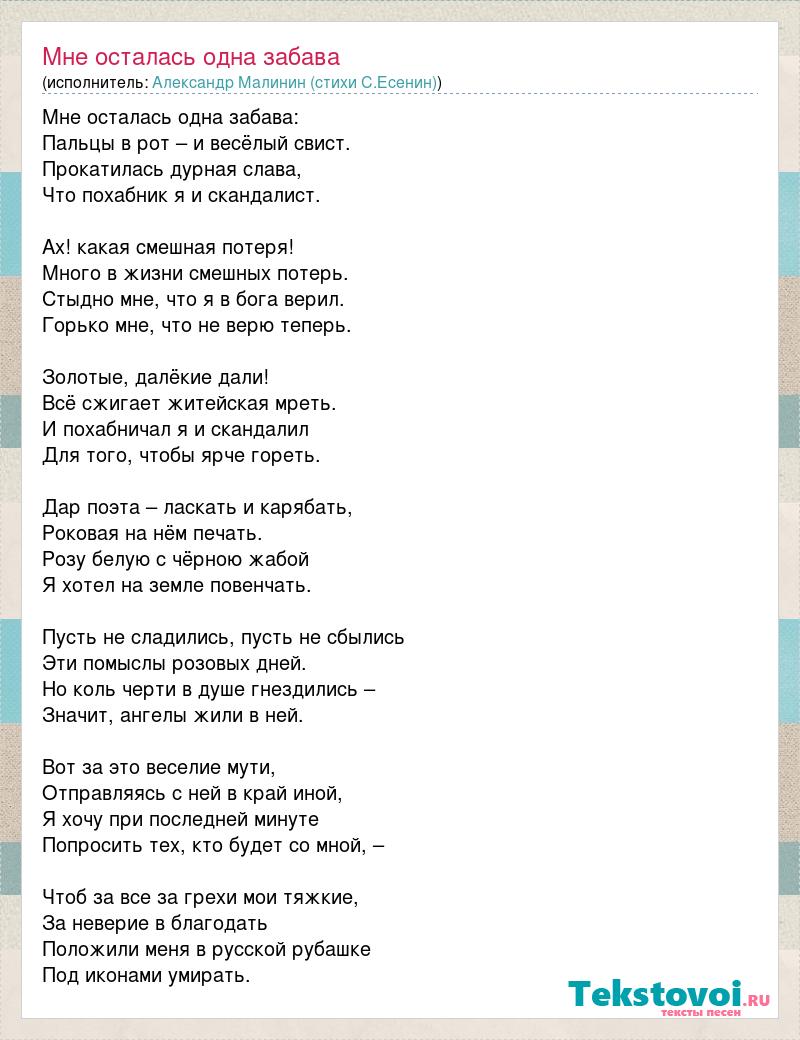 Мне осталась одна забава: Пальцы в рот – и весёлый свист. Прокатилась дурная слава, Что похабник я и скандалист. Ах! какая смешная потеря! Много в жизни смешных потерь. Стыдно мне, что я в бога верил. Горько мне, что не верю теперь. Золотые, далёкие дали! Всё сжигает житейская мреть. И похабничал я и скандалил Для того, чтобы ярче гореть. Дар поэта – ласкать и карябать, Роковая на нём печать. Розу белую с чёрною жабой Я хотел на земле повенчать. Пусть не сладились, пусть не сбылись Эти помыслы розовых дней. Но коль черти в душе гнездились – Значит, ангелы жили в ней. Вот за это веселие мути, Отправляясь с ней в край иной, Я хочу при последней минуте Попросить тех, кто будет со мной, – Чтоб за все за грехи мои тяжкие, За неверие в благодать Положили меня в русской рубашке Под иконами умирать.