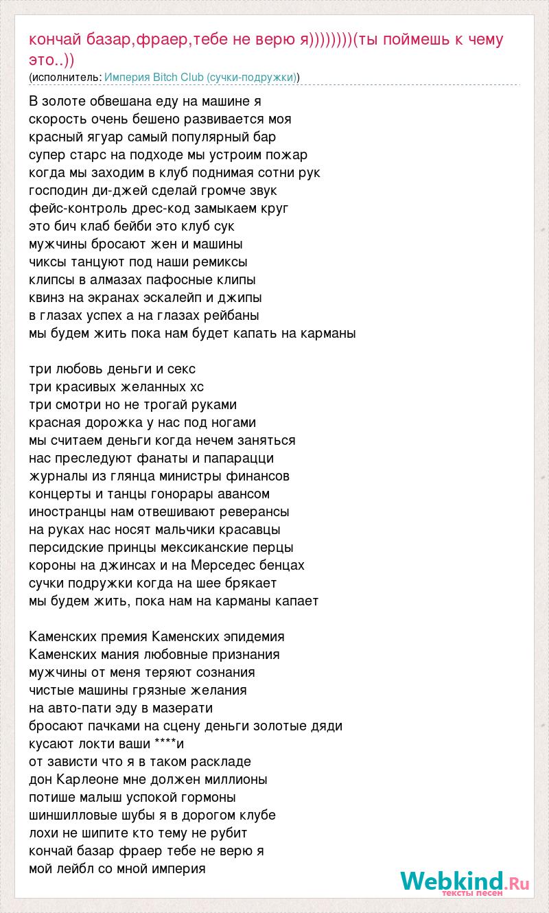 В золоте обвешана еду на машине я скорость очень бешено развивается моя красный ягуар самый популярный бар супер старс на подходе мы устроим пожар когда мы заходим в клуб поднимая сотни рук господин ди-джей сделай громче звук фейс-контроль дрес-код замыкаем круг это бич клаб бейби это клуб сук мужчины бросают жен и машины чиксы танцуют под наши ремиксы клипсы в алмазах пафосные клипы квинз на экранах эскалейп и джипы в глазах успех а на глазах рейбаны мы будем жить пока нам будет капать на карманы три любовь деньги и секс три красивых желанных хс три смотри но не трогай руками красная дорожка у нас под ногами мы считаем деньги когда нечем заняться нас преследуют фанаты и папарацци журналы из глянца министры финансов концерты и танцы гонорары авансом иностранцы нам отвешивают реверансы на руках нас носят мальчики красавцы персидские принцы мексиканские перцы короны на джинсах и на Мерседес бенцах сучки подружки когда на шее брякает мы будем жить, пока нам на карманы капает Каменских премия Каменских эпидемия Каменских мания любовные признания мужчины от меня теряют сознания чистые машины грязные желания на авто-пати эду в мазерати бросают пачками на сцену деньги золотые дяди кусают локти ваши ****и от зависти что я в таком раскладе дон Карлеоне мне должен миллионы потише малыш успокой гормоны шиншилловые шубы я в дорогом клубе лохи не шипите кто тему не рубит кончай базар фраер тебе не верю я мой лейбл со мной империя