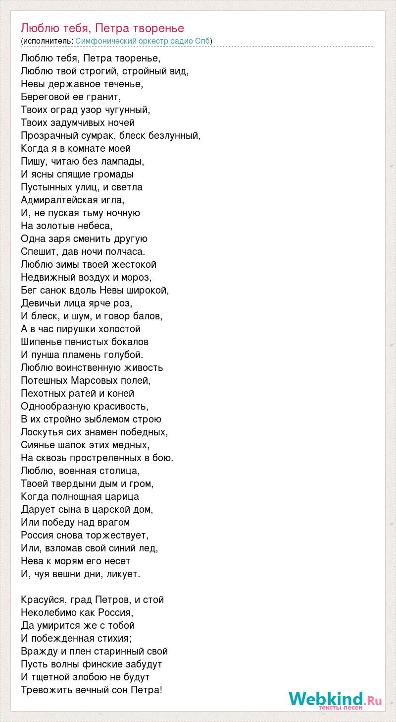 Люблю тебя, Петра творенье, Люблю твой строгий, стройный вид, Невы державное теченье, Береговой ее гранит, Твоих оград узор чугунный, Твоих задумчивых ночей Прозрачный сумрак, блеск безлунный, Когда я в комнате моей Пишу, читаю без лампады, И ясны спящие громады Пустынных улиц, и светла Адмиралтейская игла, И, не пуская тьму ночную На золотые небеса, Одна заря сменить другую Спешит, дав ночи полчаса. Люблю зимы твоей жестокой Недвижный воздух и мороз, Бег санок вдоль Невы широкой, Девичьи лица ярче роз, И блеск, и шум, и говор балов, А в час пирушки холостой Шипенье пенистых бокалов И пунша пламень голубой. Люблю воинственную живость Потешных Марсовых полей, Пехотных ратей и коней Однообразную красивость, В их стройно зыблемом строю Лоскутья сих знамен победных, Сиянье шапок этих медных, На сквозь простреленных в бою. Люблю, военная столица, Твоей твердыни дым и гром, Когда полнощная царица Дарует сына в царской дом, Или победу над врагом Россия снова торжествует, Или, взломав свой синий лед, Нева к морям его несет И, чуя вешни дни, ликует. Красуйся, град Петров, и стой Неколебимо как Россия, Да умирится же с тобой И побежденная стихия; Вражду и плен старинный свой Пусть волны финские забудут И тщетной злобою не будут Тревожить вечный сон Петра!