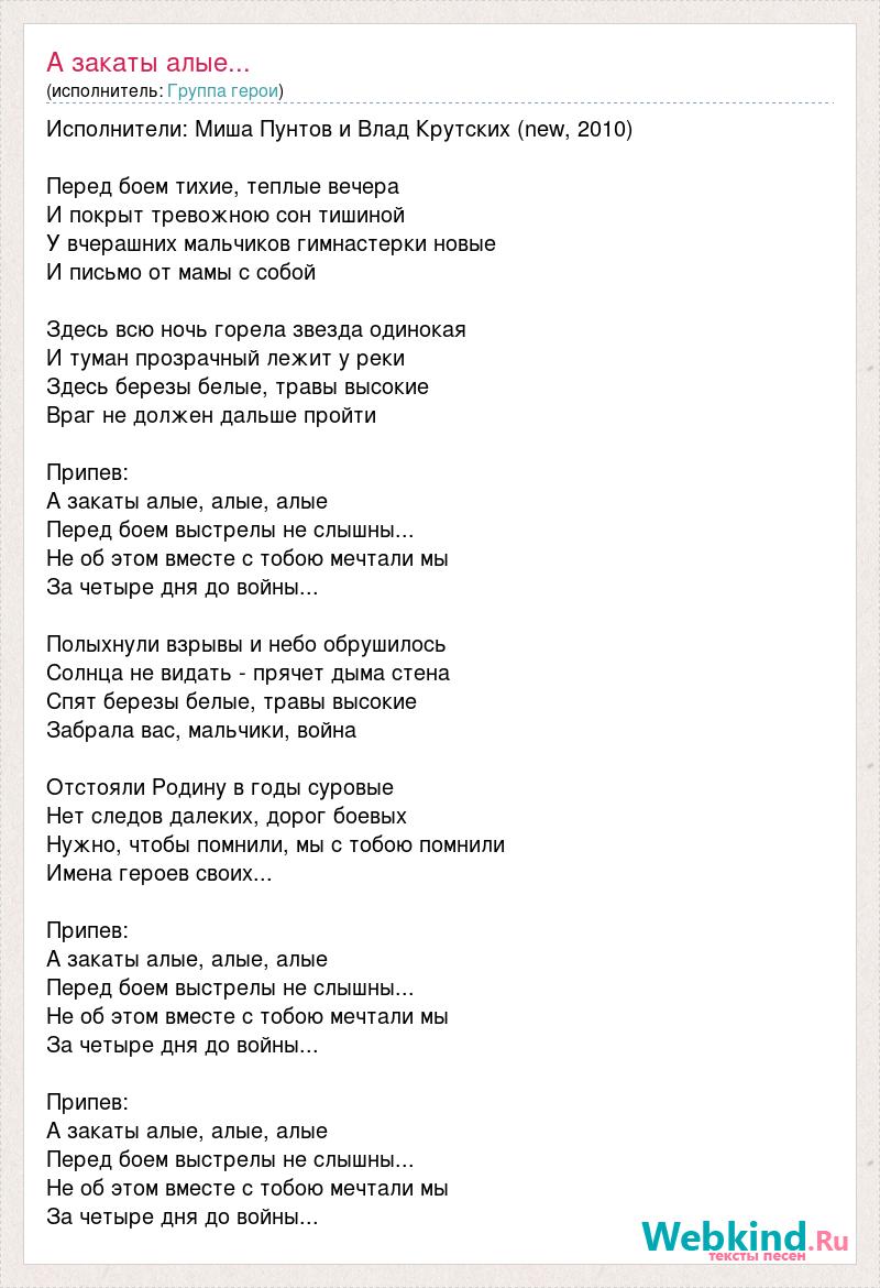 Исполнители: Миша Пунтов и Влад Крутских (new, 2010) Перед боем тихие, теплые вечера И покрыт тревожною сон тишиной У вчерашних мальчиков гимнастерки новые И письмо от мамы с собой Здесь всю ночь горела звезда одинокая И туман прозрачный лежит у реки Здесь березы белые, травы высокие Враг не должен дальше пройти Припев: А закаты алые, алые, алые Перед боем выстрелы не слышны... Не об этом вместе с тобою мечтали мы За четыре дня до войны... Полыхнули взрывы и небо обрушилось Солнца не видать - прячет дыма стена Спят березы белые, травы высокие Забрала вас, мальчики, война Отстояли Родину в годы суровые Нет следов далеких, дорог боевых Нужно, чтобы помнили, мы с тобою помнили Имена героев своих... Припев: А закаты алые, алые, алые Перед боем выстрелы не слышны... Не об этом вместе с тобою мечтали мы За четыре дня до войны... Припев: А закаты алые, алые, алые Перед боем выстрелы не слышны... Не об этом вместе с тобою мечтали мы За четыре дня до войны...