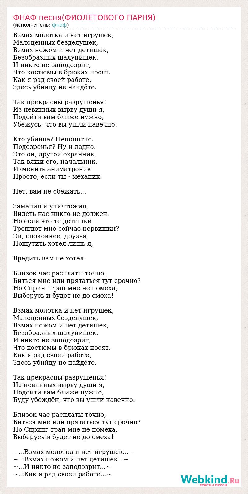 Взмах молотка и нет игрушек, Малоценных безделушек, Взмах ножом и нет детишек, Безобразных шалунишек. И никто не заподозрит, Что костюмы в брюках носят. Как я рад своей работе, Здесь убийцу не найдёте. Так прекрасны разрушенья! Из невинных вырву души я, Подойти вам ближе нужно, Убежусь, что вы ушли навечно. Кто убийца? Непонятно. Подозренья? Ну и ладно. Это он, другой охранник, Так вяжи его, начальник. Изменить аниматроник Просто, если ты - механик. Нет, вам не сбежать... Заманил и уничтожил, Видеть нас никто не должен. Но если это те детишки Треплют мне сейчас нервишки? Эй, спокойнее, друзья, Пошутить хотел лишь я, Вредить вам не хотел. Близок час расплаты точно, Биться мне или прятаться тут срочно? Но Спринг трап мне не помеха, Выберусь и будет не до смеха! Взмах молотка и нет игрушек, Малоценных безделушек, Взмах ножом и нет детишек, Безобразных шалунишек. И никто не заподозрит, Что костюмы в брюках носят. Как я рад своей работе, Здесь убийцу не найдёте. Так прекрасны разрушенья! Из невинных вырву души я, Подойти вам ближе нужно, Буду убеждён, что вы ушли навечно. Близок час расплаты точно, Биться мне или прятаться тут срочно? Но Спринг трап мне не помеха, Выберусь и будет не до смеха! ~...Взмах молотка и нет игрушек...~ ~...Взмах ножом и нет детишек...~ ~...И никто не заподозрит...~ ~...Как я рад своей работе...~