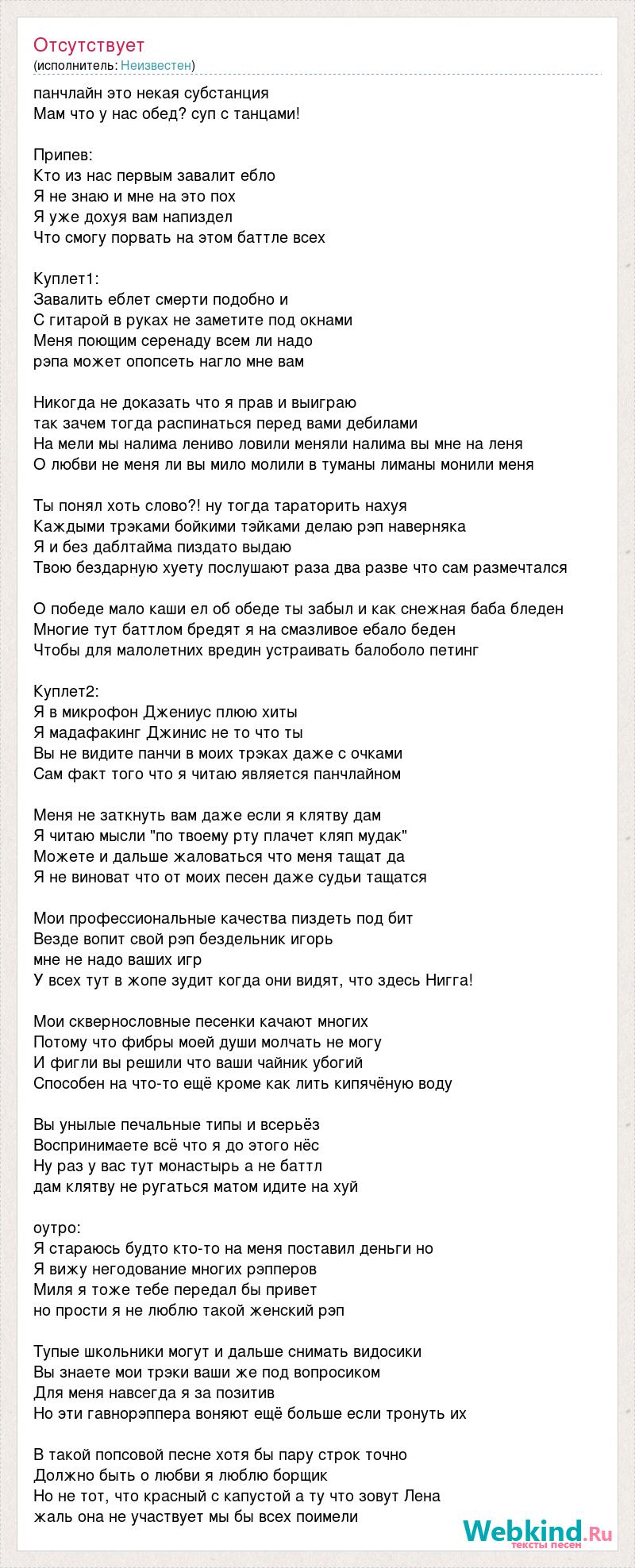 панчлайн это некая субстанция Мам что у нас обед? суп с танцами! Припев: Кто из нас первым завалит ебло Я не знаю и мне на это пох Я уже дохуя вам напиздел Что смогу порвать на этом баттле всех Куплет1: Завалить еблет смерти подобно и С гитарой в руках не заметите под окнами Меня поющим серенаду всем ли надо рэпа может опопсеть нагло мне вам Никогда не доказать что я прав и выиграю так зачем тогда распинаться перед вами дебилами На мели мы налима лениво ловили меняли налима вы мне на леня О любви не меня ли вы мило молили в туманы лиманы монили меня Ты понял хоть слово?! ну тогда тараторить нахуя Каждыми трэками бойкими тэйками делаю рэп наверняка Я и без даблтайма пиздато выдаю Твою бездарную хуету послушают раза два разве что сам размечтался О победе мало каши ел об обеде ты забыл и как снежная баба бледен Многие тут баттлом бредят я на смазливое ебало беден Чтобы для малолетних вредин устраивать балоболо петинг Куплет2: Я в микрофон Джениус плюю хиты Я мадафакинг Джинис не то что ты Вы не видите панчи в моих трэках даже с очками Сам факт того что я читаю является панчлайном Меня не заткнуть вам даже если я клятву дам Я читаю мысли "по твоему рту плачет кляп мудак" Можете и дальше жаловаться что меня тащат да Я не виноват что от моих песен даже судьи тащатся Мои профессиональные качества пиздеть под бит Везде вопит свой рэп бездельник игорь мне не надо ваших игр У всех тут в жопе зудит когда они видят, что здесь Нигга! Мои сквернословные песенки качают многих Потому что фибры моей души молчать не могу И фигли вы решили что ваши чайник убогий Способен на что-то ещё кроме как лить кипячёную воду Вы унылые печальные типы и всерьёз Воспринимаете всё что я до этого нёс Ну раз у вас тут монастырь а не баттл дам клятву не ругаться матом идите на хуй оутро: Я стараюсь будто кто-то на меня поставил деньги но Я вижу негодование многих рэпперов Миля я тоже тебе передал бы привет но прости я не люблю такой женский рэп Тупые школьники могут и дальше снимать видосики Вы знаете мои трэки ваши же под вопросиком Для меня навсегда я за позитив Но эти гавнорэппера воняют ещё больше если тронуть их В такой попсовой песне хотя бы пару строк точно Должно быть о любви я люблю борщик Но не тот, что красный с капустой а ту что зовут Лена жаль она не участвует мы бы всех поимели