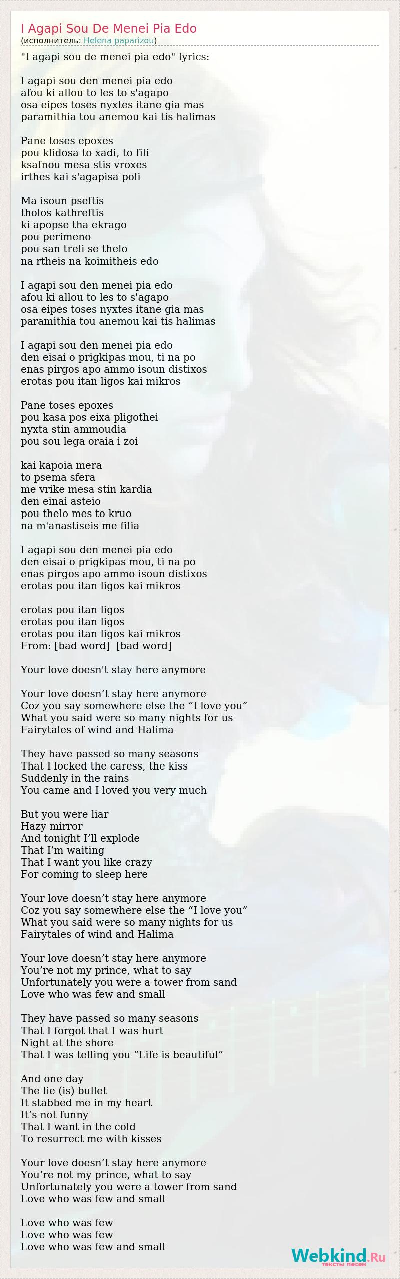 "I agapi sou de menei pia edo" lyrics: I agapi sou den menei pia edo afou ki allou to les to s'agapo osa eipes toses nyxtes itane gia mas paramithia tou anemou kai tis halimas Pane toses epoxes pou klidosa to xadi, to fili ksafnou mesa stis vroxes irthes kai s'agapisa poli Ma isoun pseftis tholos kathreftis ki apopse tha ekrago pou perimeno pou san treli se thelo na rtheis na koimitheis edo I agapi sou den menei pia edo afou ki allou to les to s'agapo osa eipes toses nyxtes itane gia mas paramithia tou anemou kai tis halimas I agapi sou den menei pia edo den eisai o prigkipas mou, ti na po enas pirgos apo ammo isoun distixos erotas pou itan ligos kai mikros Pane toses epoxes pou kasa pos eixa pligothei nyxta stin ammoudia pou sou lega oraia i zoi kai kapoia mera to psema sfera me vrike mesa stin kardia den einai asteio pou thelo mes to kruo na m'anastiseis me filia I agapi sou den menei pia edo den eisai o prigkipas mou, ti na po enas pirgos apo ammo isoun distixos erotas pou itan ligos kai mikros erotas pou itan ligos erotas pou itan ligos erotas pou itan ligos kai mikros From: [bad word] [bad word] Your love doesn't stay here anymore Your love doesn’t stay here anymore Coz you say somewhere else the “I love you” What you said were so many nights for us Fairytales of wind and Halima They have passed so many seasons That I locked the caress, the kiss Suddenly in the rains You came and I loved you very much But you were liar Hazy mirror And tonight I’ll explode That I’m waiting That I want you like crazy For coming to sleep here Your love doesn’t stay here anymore Coz you say somewhere else the “I love you” What you said were so many nights for us Fairytales of wind and Halima Your love doesn’t stay here anymore You’re not my prince, what to say Unfortunately you were a tower from sand Love who was few and small They have passed so many seasons That I forgot that I was hurt Night at the shore That I was telling you “Life is beautiful” And one day The lie (is) bullet It stabbed me in my heart It’s not funny That I want in the cold To resurrect me with kisses Your love doesn’t stay here anymore You’re not my prince, what to say Unfortunately you were a tower from sand Love who was few and small Love who was few Love who was few Love who was few and small