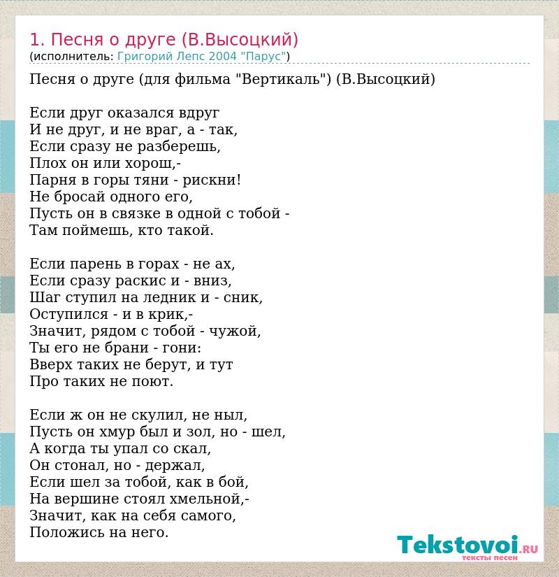 Песня о друге (для фильма "Вертикаль") (В.Высоцкий) Если друг оказался вдруг И не друг, и не враг, а - так, Если сразу не разберешь, Плох он или хорош,- Парня в горы тяни - рискни! Не бросай одного его, Пусть он в связке в одной с тобой - Там поймешь, кто такой. Если парень в горах - не ах, Если сразу раскис и - вниз, Шаг ступил на ледник и - сник, Оступился - и в крик,- Значит, рядом с тобой - чужой, Ты его не брани - гони: Вверх таких не берут, и тут Про таких не поют. Если ж он не скулил, не ныл, Пусть он хмур был и зол, но - шел, А когда ты упал со скал, Он стонал, но - держал, Если шел за тобой, как в бой, На вершине стоял хмельной,- Значит, как на себя самого, Положись на него.