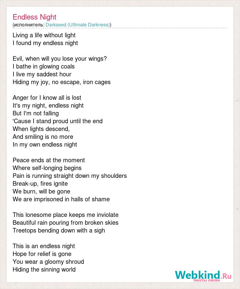 Living a life without light I found my endless night Evil, when will you lose your wings? I bathe in glowing coals I live my saddest hour Hiding my joy, no escape, iron cages Anger for I know all is lost It's my night, endless night But I'm not falling 'Cause I stand proud until the end When lights descend, And smiling is no more In my own endless night Peace ends at the moment Where self-longing begins Pain is running straight down my shoulders Break-up, fires ignite We burn, will be gone We are imprisoned in halls of shame This lonesome place keeps me inviolate Beautiful rain pouring from broken skies Treetops bending down with a sigh This is an endless night Hope for relief is gone You wear a gloomy shroud Hiding the sinning world