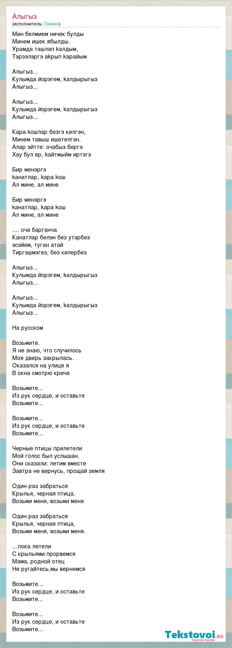 Мин белмием ничек булды Минем ишек ябылды. Урамда ташлап kалдым, Тэрзэлэргэ аkрып kарайым Алыгыз... Кулымда йорэгем, kалдырыгыз Алыгыз... Алыгыз... Кулымда йорэгем, kалдырыгыз Алыгыз... Кара kошлар безгэ килгэн, Минем тавыш ишетелгэн. Алар эйтте: очабыз бергэ Хау бул ер, kайтмыйм иртэгэ Бир менэргэ kанатлар, kара kош Ал мине, ал мине Бир менэргэ kанатлар, kара kош Ал мине, ал мине .... оча барганча Канатлар белэн без утэрбез эсэйем, туган атай Тиргэшмэгез, без килербез Алыгыз... Кулымда йорэгем, kалдырыгыз Алыгыз... Алыгыз... Кулымда йорэгем, kалдырыгыз Алыгыз... На русском Возьмите. Я не знаю, что случилось Моя дверь закрылась. Оказался на улице я В окна смотрю крича Возьмите... Из рук сердце, и оставьте Возьмите... Возьмите... Из рук сердце, и оставьте Возьмите... Черные птицы прилетели Мой голос был услышан. Они сказали: летим вместе Завтра не вернусь, прощай земля Один раз забраться Крылья, черная птица, Возьми меня, возьми меня Один раз забраться Крылья, черная птица, Возьми меня, возьми меня. …пока летели С крыльями прорвемся Мама, родной отец Не ругайтесь,мы вернемся Возьмите... Из рук сердце, и оставьте Возьмите... Возьмите... Из рук сердце, и оставьте Возьмите...