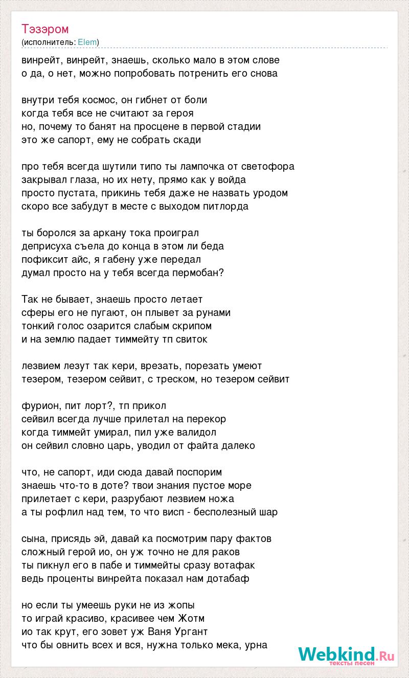 винрейт, винрейт, знаешь, сколько мало в этом слове о да, о нет, можно попробовать потренить его снова внутри тебя космос, он гибнет от боли когда тебя все не считают за героя но, почему то банят на просцене в первой стадии это же сапорт, ему не собрать скади про тебя всегда шутили типо ты лампочка от светофора закрывал глаза, но их нету, прямо как у войда просто пустата, прикинь тебя даже не назвать уродом скоро все забудут в месте с выходом питлорда ты боролся за аркану тока проиграл деприсуха съела до конца в этом ли беда пофиксит айс, я габену уже передал думал просто на у тебя всегда пермобан? Так не бывает, знаешь просто летает сферы его не пугают, он плывет за рунами тонкий голос озарится слабым скрипом и на землю падает тиммейту тп свиток лезвием лезут так кери, врезать, порезать умеют тезером, тезером сейвит, с треском, но тезером сейвит фурион, пит лорт?, тп прикол сейвил всегда лучше прилетал на перекор когда тиммейт умирал, пил уже валидол он сейвил словно царь, уводил от файта далеко что, не сапорт, иди сюда давай поспорим знаешь что-то в доте? твои знания пустое море прилетает с кери, разрубают лезвием ножа а ты рофлил над тем, то что висп - бесполезный шар сына, присядь эй, давай ка посмотрим пару фактов сложный герой ио, он уж точно не для раков ты пикнул его в пабе и тиммейты сразу вотафак ведь проценты винрейта показал нам дотабаф но если ты умеешь руки не из жопы то играй красиво, красивее чем Жотм ио так крут, его зовет уж Ваня Ургант что бы овнить всех и вся, нужна только мека, урна