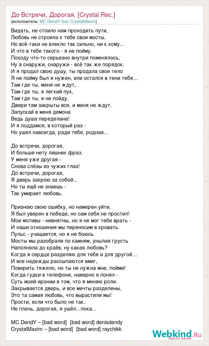 Видать, не стоило нам проходить пути, Любовь не строила к тебе свои мосты. Но всё-таки не влекло так сильно, ни к кому... И что в тебе такого - я не пойму. Походу что-то серьезно внутри поменялось, Ну а снаружи, снаружи - всё так же порядок. И я продал свою душу, ты продала свое тело Я не пойму был я нужен, или остался в тени тебя… Там где ты, меня не ждут, Там где ты, я легкий пух, Там где ты, я не пойду, Двери там закрыты все, и меня не ждут. Запускай в меня демона Ведь душа переделана! И я поддамся, в который раз - Но ушел навсегда, ради тебя, родная... До встречи, дорогая, И больше нету лишних фраз. У меня уже другая - Снова слёзы из чужих глаз! До встречи, дорогая, Я дверь закрою за собой... Но ты ещё не знаешь - Так умирает любовь. Признаю свою ошибку, но намерен уйти, Я был уверен в победе, но сам себя не простил! Мои мотивы - невнятны, но я не мог тебе врать - И наши отношения мы переносим в кровать. Пульс - учащается, но я не боюсь. Мосты мы разобрали по камням, унылая грусть Наполняла до краёв, ну какая любовь? Когда я сердце разделяю для тебя и для другой… И все надежды рассыпаются вмиг, Поверить тяжело, но ты не нужна мне, пойми! Когда гудки в телефоне, наверно я понял - Суть моей иронии в том, что я меняю роли. Закрывается дверь, и все мечты разделены, Это та самая любовь, что вырастили мы! Прости, если что было не так. Не плачь, дорогая, я ушёл...пока... MC DendY – [bad word] [bad word] denisdendy CrystalMaxim – [bad word] [bad word] raychikk