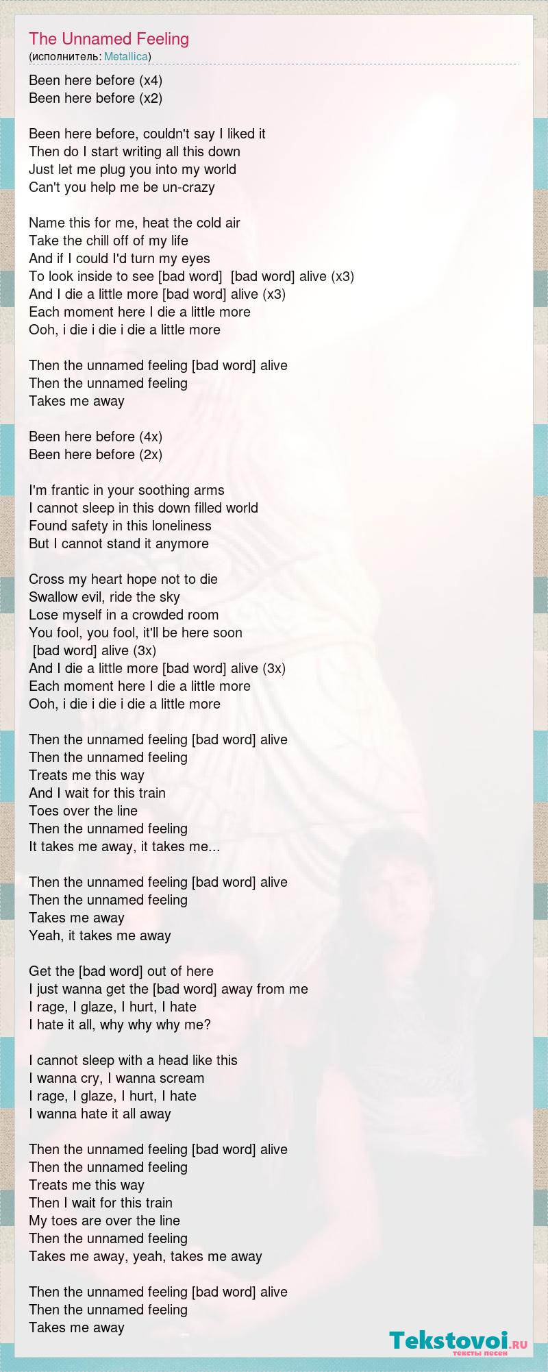 Been here before (x4) Been here before (x2) Been here before, couldn't say I liked it Then do I start writing all this down Just let me plug you into my world Can't you help me be un-crazy Name this for me, heat the cold air Take the chill off of my life And if I could I'd turn my eyes To look inside to see what's coming It comes alive (x3) And I die a little more It comes alive (x3) Each moment here I die a little more Ooh, i die i die i die a little more Then the unnamed feeling It comes alive Then the unnamed feeling Takes me away Been here before (4x) Been here before (2x) I'm frantic in your soothing arms I cannot sleep in this down filled world Found safety in this loneliness But I cannot stand it anymore Cross my heart hope not to die Swallow evil, ride the sky Lose myself in a crowded room You fool, you fool, it'll be here soon It comes alive (3x) And I die a little more It comes alive (3x) Each moment here I die a little more Ooh, i die i die i die a little more Then the unnamed feeling It comes alive Then the unnamed feeling Treats me this way And I wait for this train Toes over the line Then the unnamed feeling It takes me away, it takes me... Then the unnamed feeling It comes alive Then the unnamed feeling Takes me away Yeah, it takes me away Get the [bad word] out of here I just wanna get the [bad word] away from me I rage, I glaze, I hurt, I hate I hate it all, why why why me? I cannot sleep with a head like this I wanna cry, I wanna scream I rage, I glaze, I hurt, I hate I wanna hate it all away Then the unnamed feeling It comes alive Then the unnamed feeling Treats me this way Then I wait for this train My toes are over the line Then the unnamed feeling Takes me away, yeah, takes me away Then the unnamed feeling It comes alive Then the unnamed feeling Takes me away
