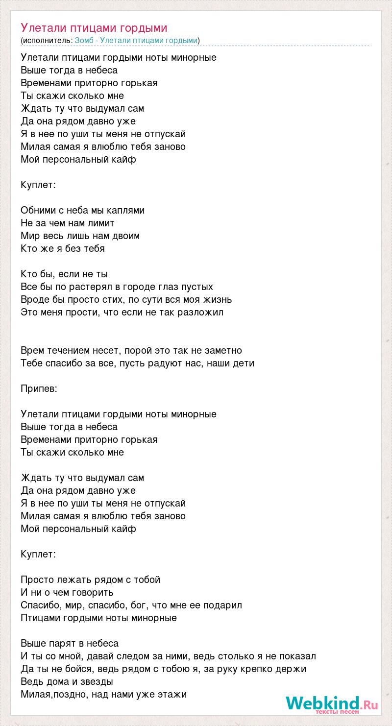 Улетали птицами гордыми ноты минорные Выше тогда в небеса Временами приторно горькая Ты скажи сколько мне Ждать ту что выдумал сам Да она рядом давно уже Я в нее по уши ты меня не отпускай Милая самая я влюблю тебя заново Мой персональный кайф Куплет: Обними с неба мы каплями Не за чем нам лимит Мир весь лишь нам двоим Кто же я без тебя Кто бы, если не ты Все бы по растерял в городе глаз пустых Вроде бы просто стих, по сути вся моя жизнь Это меня прости, что если не так разложил Врем течением несет, порой это так не заметно Тебе спасибо за все, пусть радуют нас, наши дети Припев: Улетали птицами гордыми ноты минорные Выше тогда в небеса Временами приторно горькая Ты скажи сколько мне Ждать ту что выдумал сам Да она рядом давно уже Я в нее по уши ты меня не отпускай Милая самая я влюблю тебя заново Мой персональный кайф Куплет: Просто лежать рядом с тобой И ни о чем говорить Спасибо, мир, спасибо, бог, что мне ее подарил Птицами гордыми ноты минорные Выше парят в небеса И ты со мной, давай следом за ними, ведь столько я не показал Да ты не бойся, ведь рядом с тобою я, за руку крепко держи Ведь дома и звезды Милая,поздно, над нами уже этажи