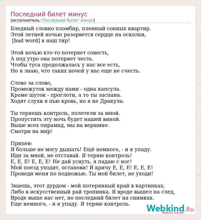 Бледный словно пломбир, пленный сонных квартир. Этой летней ночью разорвется сердце на осколки, [bad word] в наш тир! Этой ночью кто-то потеряет совесть, А под утро она потеряет честь. Чтобы туса продолжалась у нас все есть, Но я знаю, что таких ночей у нас еще не счесть. Слово за слово, Промежуток между нами - одна капсула. Кроме шуток - проглоти, а то ты заспана. Ходят слухи я пью кровь, но я не Дракула. Ты теряешь контроль, полетели за мной. Пропустить эту ночь будет нашей виной. Выше всех пирамид, мы на вершине. Смотри на мир! Припев: Я больше не могу дышать! Ещё немного, - и я упаду. Иди за мной, не отставай. Я теряю контроль! Е, Е, Е! Е, Е, Е! Не дай уснуть, я падаю с ног! Мой поезд уходит, останови! Я кричу Е, Е, Е! Е, Е, Е! Проведи меня по подножью. Ты мой билет, не уходи! Знаешь, этот дурдом - мой потерянный край в картинках, Либо в искусственный рай тропинка. Я вроде вышел на след, Вроде выше нас нет, но последний билет на снимках. Еще немного, - и я упаду. Я теряю контроль.