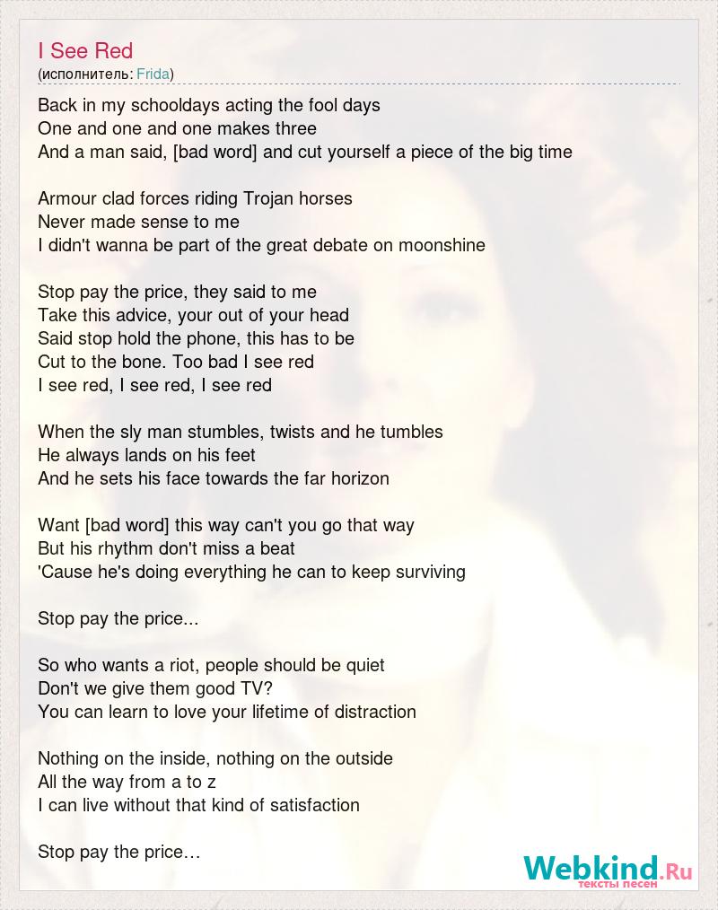 Back in my schooldays acting the fool days One and one and one makes three And a man said, [bad word] and cut yourself a piece of the big time Armour clad forces riding Trojan horses Never made sense to me I didn't wanna be part of the great debate on moonshine Stop pay the price, they said to me Take this advice, your out of your head Said stop hold the phone, this has to be Cut to the bone. Too bad I see red I see red, I see red, I see red When the sly man stumbles, twists and he tumbles He always lands on his feet And he sets his face towards the far horizon Want [bad word] this way can't you go that way But his rhythm don't miss a beat 'Cause he's doing everything he can to keep surviving Stop pay the price... So who wants a riot, people should be quiet Don't we give them good TV? You can learn to love your lifetime of distraction Nothing on the inside, nothing on the outside All the way from a to z I can live without that kind of satisfaction Stop pay the price…